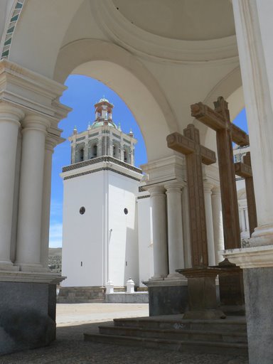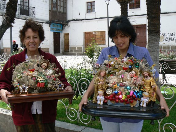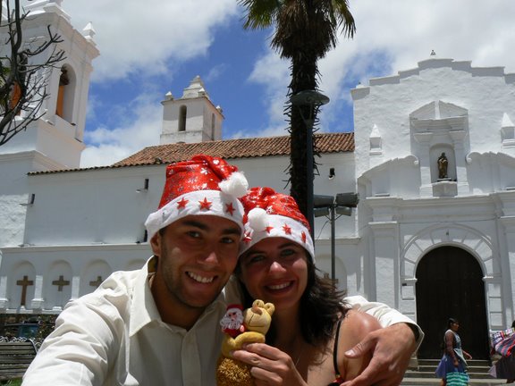 Après un petit détour à Cochabamba, nous voici à Sucre, capitale constitutionnelle de la Bolivie, La Paz étant le siège du gouvernement et des finances. Cette jolie cité aux murs chaulés a su préserver sa belle architecture coloniale. Elle est même inscrite au patrimoine mondial de l’Unesco depuis 1991. C’est ici que fut déclarée l’indépendance en 1825 grâce aux actions de Simón Bolívar – el libertador. Aujourd’hui, le mouvement semble perdurer et Sucre ou Chuquisaca se réclame comme « capitale pleine ». Sur la place centrale du 25 de mayo, les habitants sont invités à signer une pétition pour l’autonomie de la province de Chuquisaca et le refus de la nouvelle constitution. C’est une voie plus sage que celle empruntée il y’a quelques semaines qui coûta la vie de plusieurs personnes… C’est en tout cas très sérieux, les signataires doivent laisser leurs empreintes, un peu comme aux temps préhistoriques… Je m’explique. A quelques kms du centre, nous avons pu observer des traces de papattes laissées par des tout gros animaux tout vieux : les dinosaures ! En effet, en 1994, les ouvriers d’une usine de ciment en dégageant le terrain, ont découvert une paroi argileuse pratiquemment verticale portant plus de 6000 empreintes. Certaines mesure jusqu’à 80 cm de diamètre et révèlent le passage de plus de 150 espèces de dino : ça devait être l’A6 de l’époque, « l’autoroute du soleil » ! Nous avons également fait une petite rando sur un sentier précolombien dans la superbe Cordillera de los Frailes, formidable barrière multicolore entre les départements de Chuquisaca et Potosí. Nous avons réveillonné au restaurant de l’Alliance Française et profité d’un succulent repas avant d’assister à la traditionnelle messe de minuit. Comme vous pouvez le constater sur la photo, les Boliviens fabriquent des compositions qui représentent la naissance du Christ. Une fois baptisées, celles-ci seront disposées dans un lieu de choix pour le repas de Noël en famille. A ce propos, nous avons eu le plaisir de pouvoir joindre nos familles par téléphone, c’était la première fois depuis le départ, un bon moment ! Nous profitons de l’occasion pour vous souhaiter, à vous tous qui nous suivez, de joyeuses fêtes. Profitez de vos proches, prenez soin d’eux et soin de vous. Gros bisous à tous de Denis et Mélanie… j’oubliais… et de Schkroumpf !!