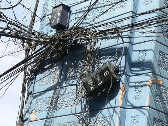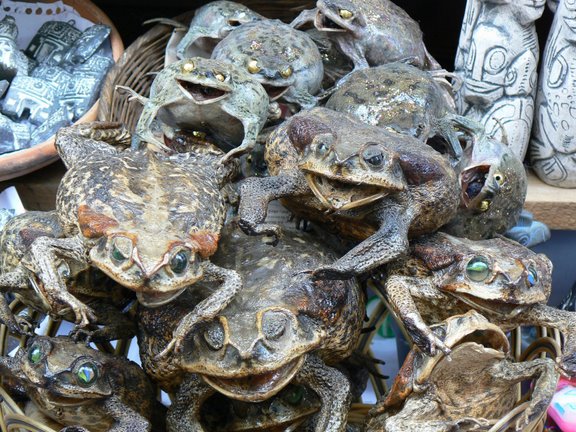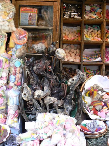 Nous nous sommes baladés au sein du folklorique marché aux sorcières. Si vous cherchez un quelconque remède dérivé des sciences occultes, des médecines parallèles et surtout du « foutage de g… », ce marché vous ravira… Plus sérieusement, on peut donc y acheter des fœtus de lama (enterré dans les fondations de votre maison, il protégera votre foyer), des crapauds aux yeux dorés (ils vous apporteront fortune), toutes sortes d’amulettes, de lotions aphrodisiaques, qui conjureront le mauvais sort et vous dépouilleront miraculeusement de votre argent. Tout aussi fantasmagoriques, les gâteaux aux allures pourtant alléchantes, se révèlent au palais plutôt décevant. On est loin des gâteaux de Sébastien. Mais bon, niveau coloration, un point pour la Bolivie, ils sont magnifiques ! Le plaisir des yeux sans les kilos en trop, un concept tendance ! Si je n’ai pas eu encore le temps de vous parler des douches électriques (si, si !), c’est parce qu’il me fallait remonter le fil. Vous jugerez par vous-même sur la photo ci-jointe que l’affaire n’est pas simple…