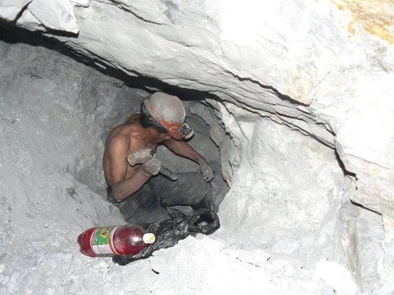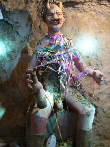 Voici une visite que nous ne sommes pas prêts d’oublier! Avant de pénétrer dans l’antre de celui que les mineurs dénomment affectueusement Tío (oncle) – jamais diablo – nous faisons halte dans un marché un peu spécial… C’est à cet endroit que les mineurs achètent tout ce dont ils ont besoin: feuilles de coca, cigarettes, alcool (96º!)… mais aussi acétylène et dynamite! Il est de bon ton d’offrir quelques présents aux mineurs en leur rendant visite. C’est ainsi que nous avons pû acheter de la dynamite en toute légalité, comme le gamin du quartier, ou le terroriste du coin… Nous découvrons ensuite dans un ingenio (fonderie) comment le minerai est concassé, comment on sépare les différents élèments qui le composent (plomb, zinc, silice…) pour obtenir enfin l’argent par tout un jeu d’actions chimiques et mécaniques. Nous voici parrés pour le grand plongeon, allez on y va! Dans les mines coopératives du Cerro Rico, les températures varient de moins de 0ºC à 45ºC aux quatrième et cinquième niveaux ! Exposés à toutes sortes de produits chimiques et de gaz nocifs (poussières de silice, arsénique, amiante...), la balade n’est pas des plus aisées. D’autant plus qu’il nous faut souvent ramper pour s’introduire dans les galeries, à 4200m d’alt., c’est franchement du sport ! Mais bon... nous n’y serons qu’une matinée et quelle expérience ! Les hommes (ou les gamins) que nous allons y croiser y passent eux, généralement 9,10 h par jour. Les conditions de travail n’ont guère changées depuis le début de l’exploitation, il y’a plus de quatre siècles. Les mines leur appartenant, les mineurs doivent produire suffisament pour gagner leur vie. Les salaires sont souvent maigres, en moyenne de 800 à 1500 bolivianos (soit 80 à 150 euros/mois). Selon le travail fourni et la qualité du minerai certains peuvent gagner plus. Ils se servent d’explosifs et d’outils qu’ils achètent eux-mêmes, y compris les lampes à acétylène qui permettent de déceler les poches mortelles de monoxyde de carbone. Quand on parle de pénébilité du travail, si il n’y’a pas d’indice maximum, j’en propose un. L’exposition quotidienne aux gaz et autres produits chimiques couplée à la dureté du labeur ne leur permet pas d’envisager une longue carrière, ni une longue vie... Beaucoup meurent de silicose après une quinzaine d’années passées dans la mine. Aussi pour conjurer le mauvais sort et oublier quelques instants leur difficile existence les mineurs organisent des cérémonies. Ainsi, on verse aux pieds de la statue de Tío un peu d’alcool, on lui place des cigarettes dans la bouche et des feuilles de coca à portée de mains. Puis les mineurs fument, machent de la coca et s’ennivrent ensemble, chacun sachant que sa condition vaut pour les « pottes aussi »...