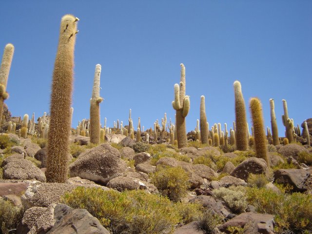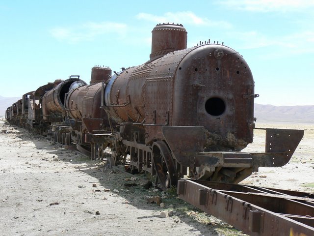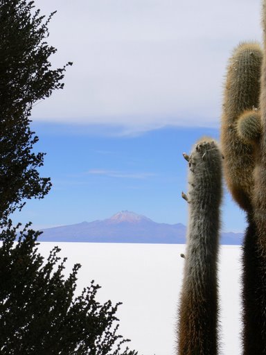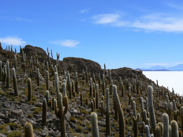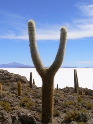 Nous voici enfin partis pour la cerise sur le bateau ; le clou du pestacle bolivien : le circuit du sud-ouest. Cette région est un exceptionnel ensemble de paysages grandioses : de l’aveuglante blancheur du Salar aux lagunes multicolores du Sud Lipez en passant par des foyers d’activité géothermique, bienvenue sur la planète beauté ! Avant de rejoindre le Salar, nous faisons halte au cimetière de trains. De vieilles locos, qui autrefois servaient au transport du minerai, stagnent là, au milieu du désert , le temps de voir passer le train... Nous rencontrons ensuite les habitants du pueblo de Colchani. La grande majorité vit de l’extraction du sel et de son conditionnement, les autres de l’artisanat (figurines en sel...). Nous voici à présent sur le Salar. Plus vaste réserve de sel au monde, le Salar d’Uyuni s’étend sur 12000km² à quelques 3650m d’altitude et le sel atteind par endroit jusque 12m d’épaisseur. Vestige d’un ancien lac évaporé, cette vaste étendue saline est une accumulation de minéraux. Lessivés des montagnes, ils viennent se déposer au point le plus bas. En effet, cette partie de l’Altiplano est endoréique, ce qui signifie que ses cours d’eau se perdent dans les terres, le sel n’est donc pas drainer en aval, vers un cours d’eau plus important et se dépose ainsi peu à peu. Nous profitons du cadre pour faire quelques photos-montage comme le veut la tradition et surtout parce que ça nous amuse beaucoup... La suite du périple nous emmène sur la ravissante Isla Incahuasi. L’île semble flotter sur le Salar. Envahie par de gigantesques cactus dont certains pourraient avoir 1200 ans, elle est entourée par une mer blanche de plaques de sel hexagonales. Il est bien difficile de décrire de tels paysages par des mots. Je vous laisse donc rêver au travers des photos...
