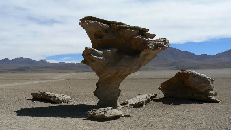 Et c'est parti pour les lagunes… Une bleue, une jaune, une blanche, une verte… Ouais sympa, même si encore une fois cela ne vaut pas le Lac des Corbeaux à La Bresse. Bon ok, le spectacle laisse sans voix. De toute manière, depuis les mines de Potosí, j'en ai plus beaucoup. Je crois avoir contracté une méchante infection à la gorge qui a au moins l'avantage de reposer Mélanie… Quoi que la petite souffre toujours de l'altitude, ils sont beaux les aventuriers!! Ces lacs riches en minéraux aux couleurs irréelles sont en plus peuplés de 3 espèces de flamants roses (F. du Chili, F. des Andes et F. de James) qui ne dénotent pas dans le paysage. Après environ 200 kms de piste cahoteuse, nous passons de l'irréel au surréel. Emporté par sa course, notre monture, un 16 (4X4 pour les puristes), dérappe, perd le contrôle et fini sa course en traversant une toile de Salvador! Cette perte de contrôle in-opinel, ne manqua pas de lui faire friser les moustaches. Heureusement, comme vous le constatez sur la reproduction photographique ci-jointe, l'arbre de pierre ( arbol de piedra) est intacte. Dalí, sû peindre avec brio ces paysages de Gala. Sans doute prit-il ses rouges dans le giron de la Laguna Colorada. Ce lac perché à près de 4300m couvre une superficie de 60 km², mais ne dépasse pas 80cm de profondeur! Son intense coloration provient des algues et du plancton qui prospèrent dans ses eaux riches en minéraux (gypse, sodium, borax…). Les sédiments du lac abondent en microfossiles (les diatomées), utilisés dans la fabrication de nombreux produits: engrais, peintures, dentifrice… Ceux-ci servent également d'agent filtrant pour l'huile, les produits pharmaceutiques, le kérosène mais aussi la bière et le vin. Nous ne croiserons pas les éléphants de Dalí, mais seulement quelques vigognes (camélidés de la famille du lama) et quelques viscaches (chienchienhideux de la famille du chinchilla). Mélanie pourtant, la coca aidant, me dira en avoir vu un tout gros, tout rose, la chanceuse…
