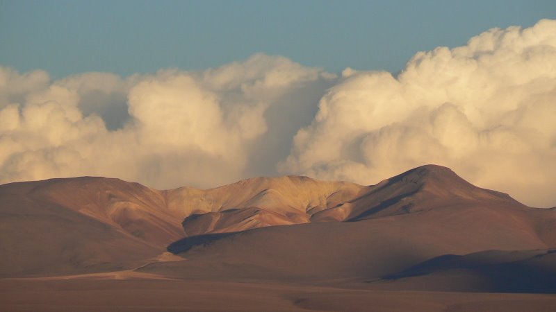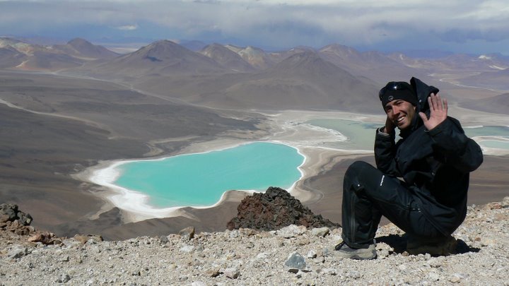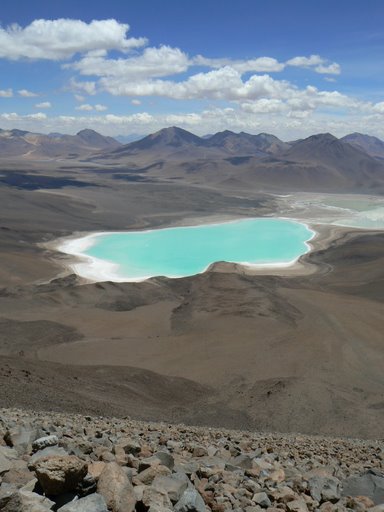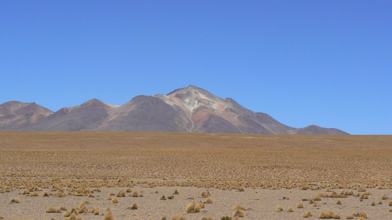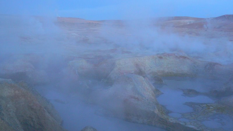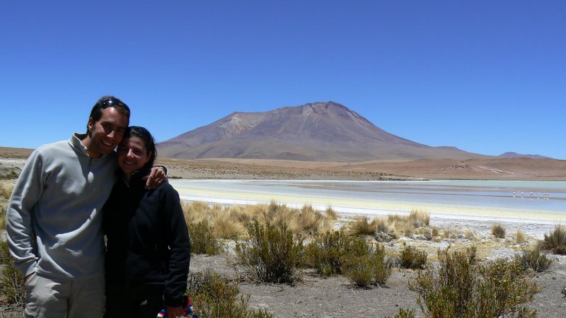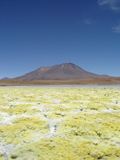 Réveil aux aurores pour voir le levé du soleil sur les geysers de Sol de Mañana. Les mares de boue bouillonnante et les vapeurs sulfureuses n'invitent pas Mélanie à la baignade. A 4850m d'altitude, elle se sent vraiment mal et l'on redescend vite, la fin du "calvaire altitude" pour elle. Quelque chose me dit que l'on ne fera pas l'ascension du K2 l'an prochain… Les paysages au levé du soleil sont d'une exceptionnelle beauté. Nous arrivons ensuite à la Laguna Verde. Ce magnifique lac bleu-vert, perché à 4400m, doit sa superbe couleur à l'importante concentration en carbonates de plomb, de souffre, d'arsenic et de calcium. Bref, mieux vaut ne pas boire la tasse! Derrière le lac se dresse le cône du volcan Licancabur (5960m) à la physionomie parfaite. Voici le carnet de route du 31 déc. 2007, j'attends après un gagnant au jeu pour écrire celui du 1er janvier 2008…