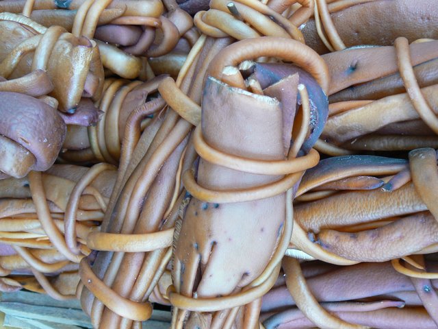 Sur l'île Quinchao, au marché artisanal, nous apprenons les noms des spécialités locales comme ces algues alimentaires en photo : cochayullo, qui font partie intégrante de l'alimentation des insulaires mais pas seulement, hum ! Non, vraiment, merci, un petit Chili con carne fera l'affaire…