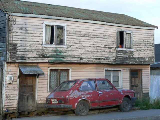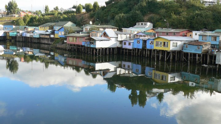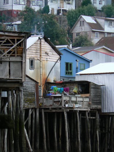 Si l'on accepte une certaine distorsion géographique, Chiloé est à mi-chemin entre les Vosges et la Bretagne, ouais... Hors de l'espace, elle semble aussi hors du temps et je déplore de ne pouvoir y rester plus longtemps pour me faire conter par un vieux loup de mer la fascinante mythologie chilote. Les sorcières, gnomes et autres nymphes sont aux avant-postes et que dire d'Invuche ? Garde grotesque, cet ancien humain qui vit dans une grotte a été kidnappé puis défiguré : on lui fit tourner la tête à 180 dégrés, on lui attacha une jambe dans le dos et cousa un bras sous la peau. Si vous croyez l'avoir aperçu... consultez ! Vous l'aurez compris, il y a de la magie sur Chiloé. Dans ses ports brumeux, les vieux rafiots de pêche semblent comme abandonnés à marée basse. A marée haute, ils viennent s'amarrer aux jolies bicoques qui font tout le charme de Chiloé : les palafitos. Ces maisons en bois que l'on trouve au bord de l'eau, sont construites sur pilotis, leurs toitures sont en bardeaux, comme Brigitte ; sur la plage, abandonnées...