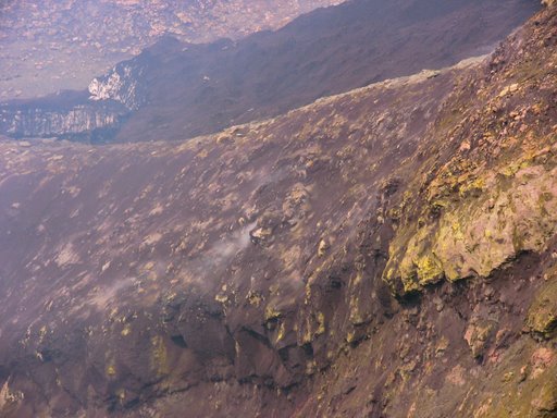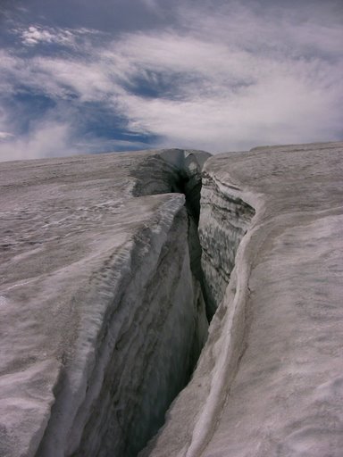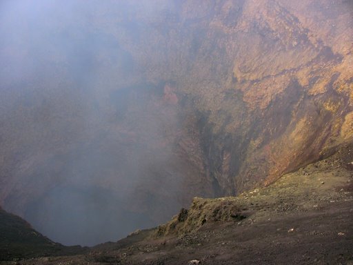 Optimiste et fou, voilà bien deux aspects de ma personnalité, je me devais donc d'aller voir le géant de plus près. Départ à 3h30, nous commençons l'ascension une heure plus tard. La veille, des chutes de grosses pierres ont effrayés un groupe qui entreprenait l'ascension, du coup il est préférable de partir de bonne heure, pour avoir des conditions optimales. Après une heure et demi de marche sur un sentier poussiéreux au clair de lune, nous faisons une première halte pour admirer le lever de soleil sur les vallées en contrebas, magique. Puis, nous chaussons les crampons, nous nous armons de nos piolets et ainsi parés nous nous lançons sur les pentes du glacier, l'occasion d'observer d'impressionnantes crevasses. Nous abandonnons les crampons et une petite demi heure de plus nous conduit au sommet. Là, la surprise est de taille, le cratère est un immense gouffre béant et fumant. L'air est empli des émanations de souffre et autres gaz toxiques qui s'échappent du cratère et des cheminées annexes. Quel spectacle! La descente est plus rapide, mais toujours ponctuée de "rock" ou "piedra", chaque fois qu'une pierre vient à dévaler la pente. Et pour gagner le bas du glacier, quoi de mieux que de se laisser glisser dans des toboggans naturels? Comme dirait Brice: "ça farte!".
