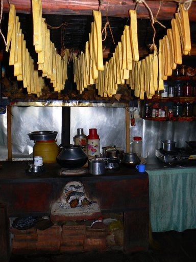 [dry cheese : « fromage sec » en photo, suspendu au plafond pour sécher, pain tibétain : semblable à nos délicieux beignets de carnaval en un peu moins gras, hum ! chnagk : mot vosgien désignant une viande peu tendre (j'entretiens mon vôsgien pour communiquer avec les autochtones à mon retour =)]