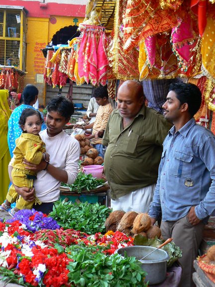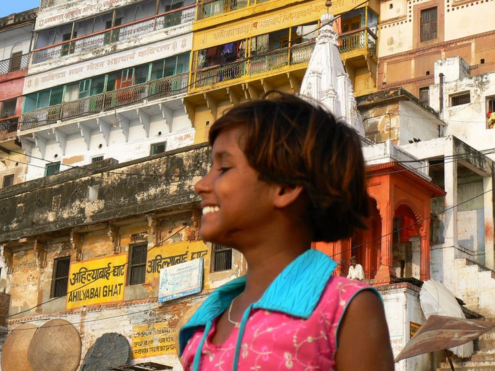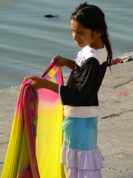 En dehors de la toilette, les Indiens hindous viennent accomplir une puja (offrande). On trouve ainsi beaucoup de vendeuses de fleurs aux abords des ghats. Sandhya, 10 ans, se lève très tôt chaque matin pour proposer ses petites bougies flottantes avant d'aller à l'école. Elle aide sa maman dans son commerce.