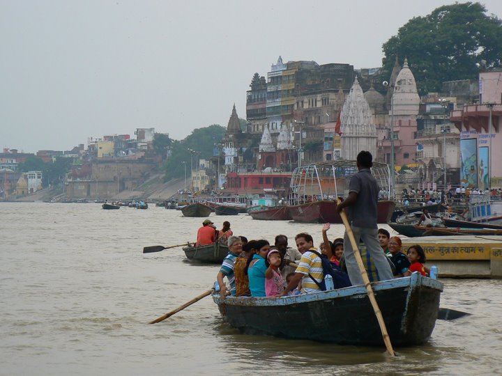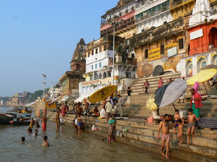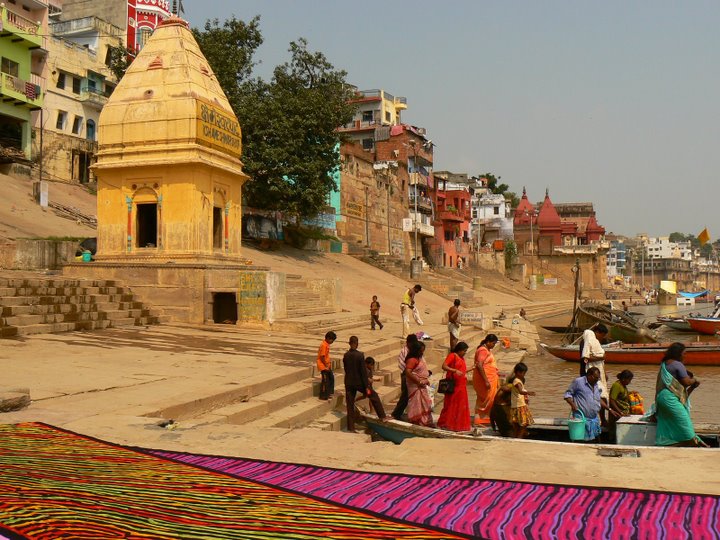 Ici, se côtoyent les rites les plus intimes de la vie et de la mort. Ma guesthouse se trouve ainsi près du principal ghat de crémation, sympa, je ne savais pas... D'immenses tas de bois s'empilent au sommet du ghat. Les corps, recouverts d'un linge, sont transportés à travers les ruelles de la vieille ville sur des brancards de bambou par des hors-castes, appelés dom. Ils sont ensuite plongés dans le Gange avant la crémation. Les femmes enceintes, les bébés, et certaines castes n'ont pas droit au bûcher et l'on jette les corps au milieu du fleuve. Je l'ai appris à mes dépends après 5mn de barque. « Body » me dit le batelier. Je peux vous dire que ca fait une drôle d'impression...