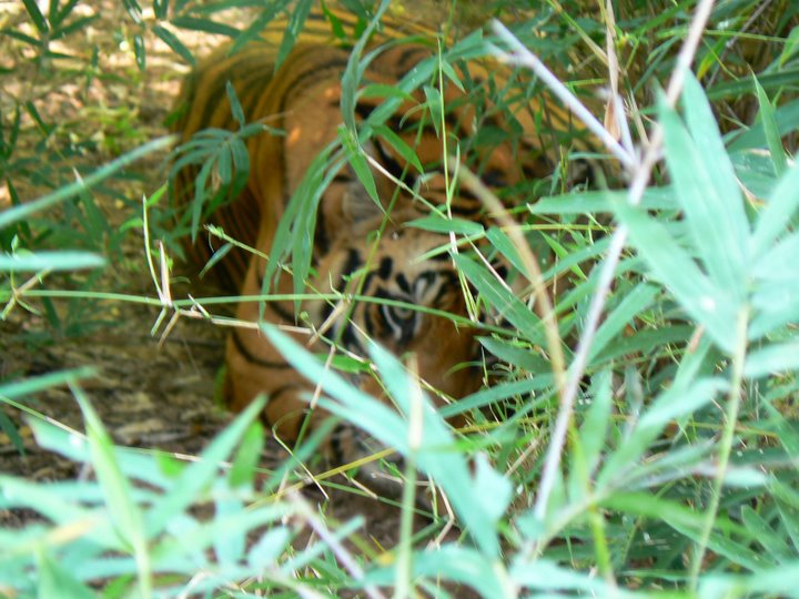 La photo est malheureusement floue mais je n'ai pas eu la latitude de lui demander de bien vouloir poser en dehors des fourrés. C'est un petit, enfin, un jeune tigre quoi. Sa maman n'est pas loin et veille attentivement. J'aurai aimé une rencontre plus impromptue, mais c'est affaire de chance et je suis déjà bien heureux d'avoir pu en observer dans leur milieu naturel. Un Français qui partage ma jeep me raconte l'histoire d'une voyageuse qui s'était retrouvé en tête à tête avec un tigre. La pauvre à passée 24h dans un état de semi folie, à trembler de tous ces membres. Quand un tigre vous regarde, c'est quelque chose d'assez incroyable, magnifique et paralysant...