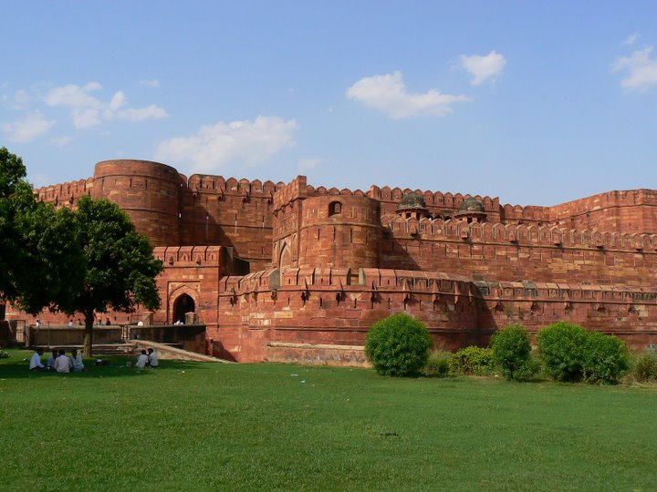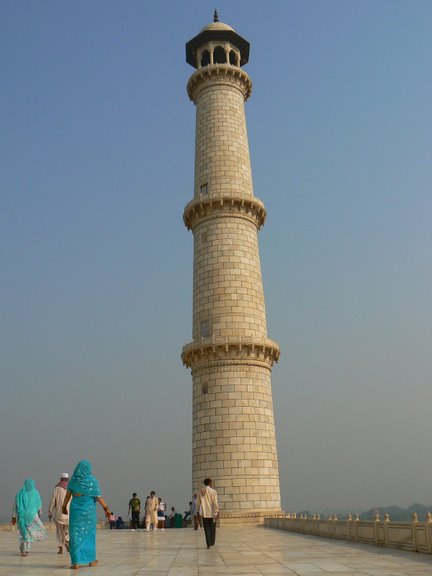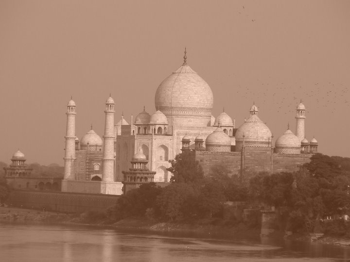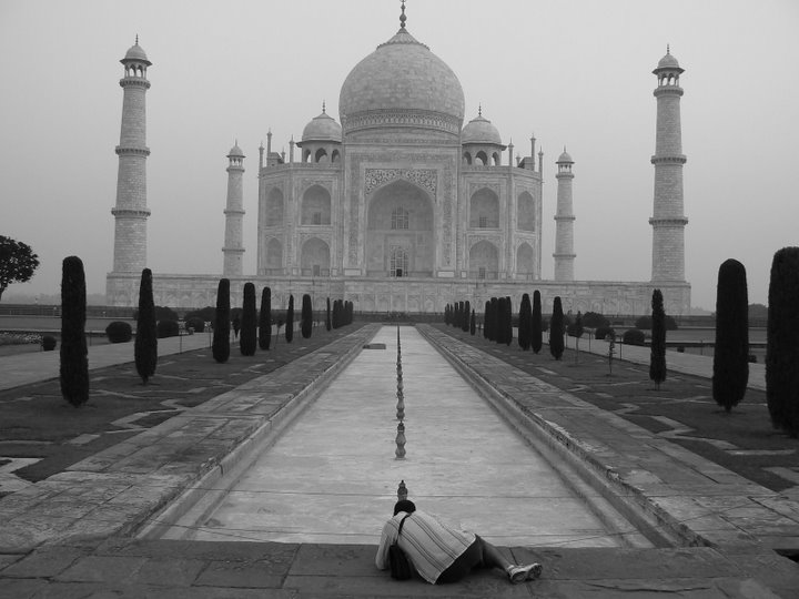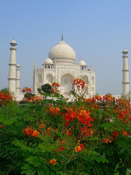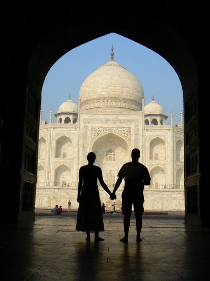 Le Taj Mahal fut construit par l'empereur Shah Jahan pour recevoir le corps de sa deuxième épouse Mumtaz, morte en mettant au monde son 14ème enfant en 1631. Son trépas brisa le cœur de l'empereur dont les cheveux seraient devenus gris en une nuit. Peu de temps après, Shah Jahan fut renversé par son fils Aurangzeb et emprisonné au fort d'Agra d'où, le restant de sa vie, il ne pu qu'apercevoir sa création par la fenêtre. A sa mort, en 1666, il fut inhumé auprès de Mumtaz, un vrai conte des milles et une nuits, non ?