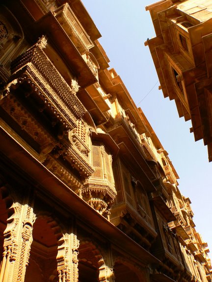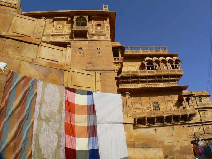 Deuxième volet de notre périple au Rajasthan. Nous voici aux portes du Désert du Thar, les mirages commencent. En approchant Jaisalmer, on a l'impression de se diriger vers un gigantesque château de sable, trônant en haut d'une colline. La vérité n'est pas loin. En effet, au milieu d'un paysage désertique, une magnifique forteresse de grès doré domine cette cité millénaire. Ses 99 bastions entourent d'étroites ruelles qui serpentent entre des havelis ouvragés. Ces riches demeures de grès et de bois finement sculptées, furent pour la plupart bâties par des négociants, marchands de brocards, de bijoux, etc... Dès le XIIème siècle, Jaisalmer prospéra grâce à sa position stratégique sur la route des caravanes entre l'Inde et l'Asie Centrale. Aujourd'hui, elle est tournée vers le tourisme et pour cause, le cadre est vraiment enchanteur. Dans le prochain épisode, retrouvez Denis à dos de chameau unibosse (une espèce très rare). Alors, ne partez pas maintenant, restez au moins pour le désert...