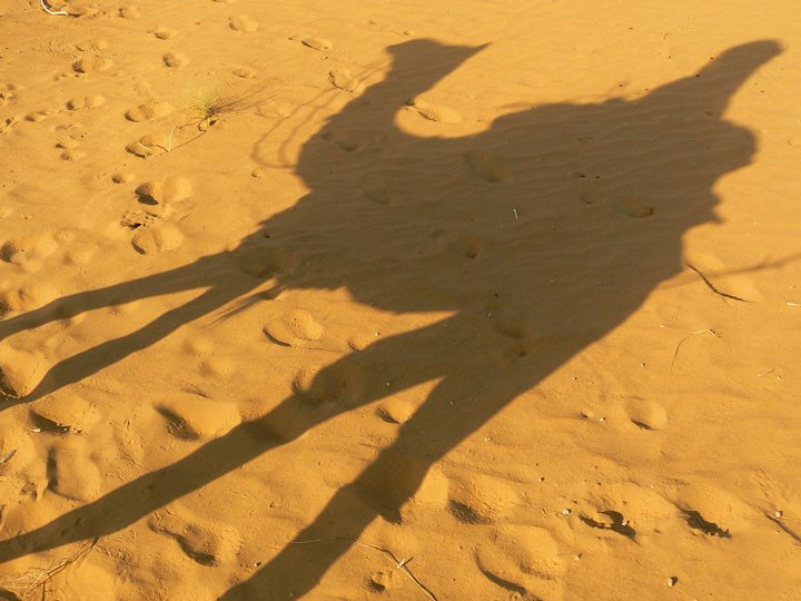Après une trentaine de kilomètres en jeep, nous changeons de montures et je grimpe pour la première fois sur un gentil camélidé bossu: un dromadaire. Nos dromadoriers (je sais pas comment on dit...) sont super sympa. L'un deux n'est qu'un petit bonhomme de 12 ans! Ce qui ne l'empêche pas d'avoir un parfait contrôle des dromadaires et d'être d'une efficacité redoutable dans toutes les tâches quotidiennes de la vie du désert. C'est d'ailleurs ces besognes qui rythment la vie des villageois qui habitent les rares hameaux que nous croisons. Aller chercher de l'eau, du bois, travailler la terre en espérant la pluie... C'est une vie à part. En tout cas, cette courte escapade de deux jours dans le désert m'a beaucoup plu. C'est un milieu fascinant qui, contrairement à ce que l'on pourrait croire abrite bien des espèces. Tiens d'ailleurs j'ai même vu « la bête des Vosges » (photo à l'appui). Comme le Dahut, ses jambes de longueurs différentes, lui permettent facilement de se mouvoir sur les pentes des dunes...