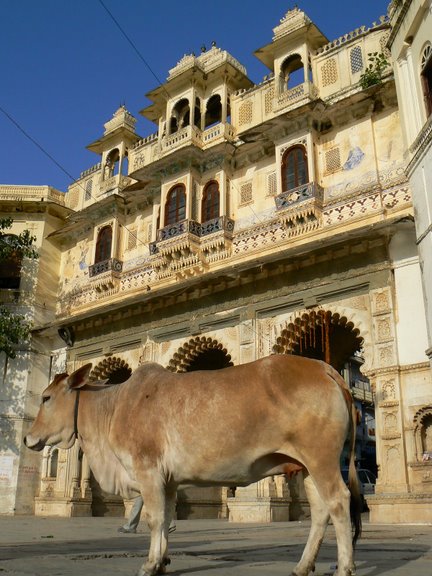 Le Rajasthan est définitivement une région magique et cette cité que je découvre a des allures de Venise orientale. Le lac Pichola, au cœur de la ville, est entouré de bâtiments chatoyants et de palais somptueux. Parmi ceux-ci, le palais flottant, joyau d'Udaïpur, servit par ailleurs de décor pour des scènes d'un film de James Bond (Octopussy). Aujourd'hui, la plupart de ces palais sont devenus des palaces dont les prix prohibitifs ne passaient pas vraiment dans mon budget !