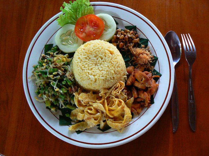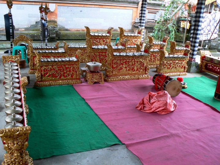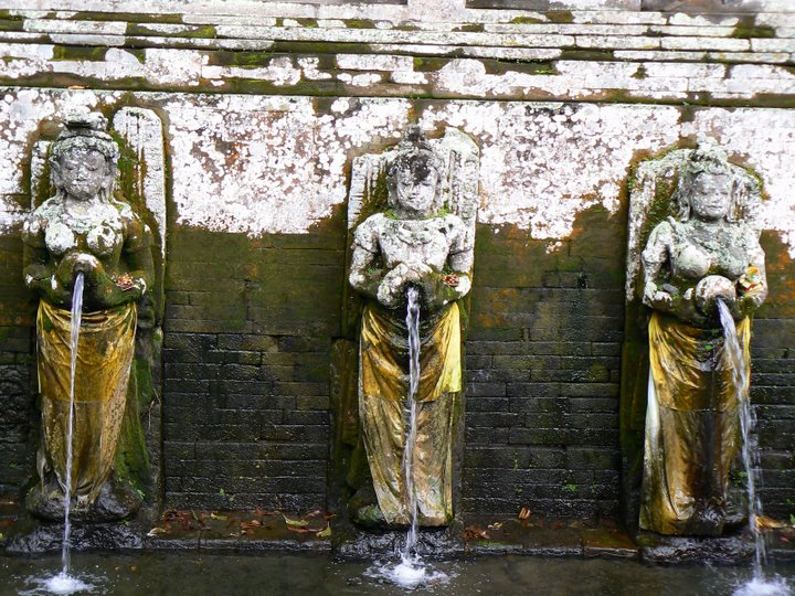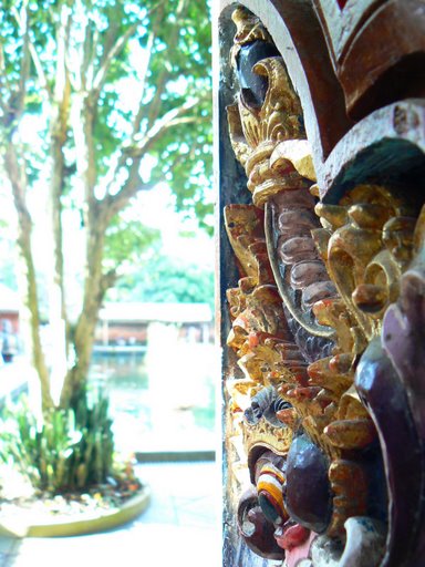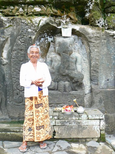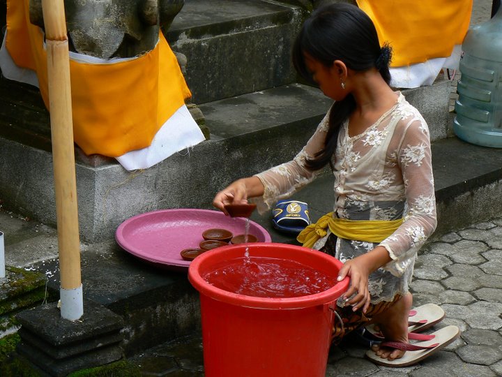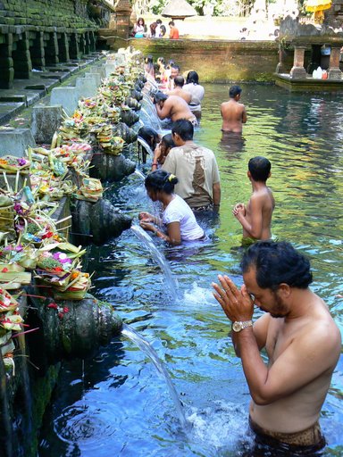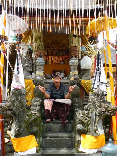 Tu as faim ? Bon, très bien. Commençons par la nourriture balinaise. A l'image du reste, elle est raffinée. Je n'ai encore pas mal mangé, malgré une belle tentative aujourd'hui en mangeant dans un superbe boui-boui (4 agglos, une planche et des gamelles au bord de la route) : c'était bon. D'une manière générale, le riz entre dans la composition de nombreux plats, le poulet, le porc, le thon, les fruits de mer viennent l'accompagner dans l'assiette dans une savoureuse déclinaison de curry et d'autres sauces délicieuses. Pas facile de décrire une cuisine en quelques mots… Je dirais simplement que c'est de bon à très bon, toujours très bien présenté, quant au prix, le plat en photo m'a coûté moins d'un euro ! Te voilà rassasié. Reste à étancher ton insatiable soif de culture... Celle-ci n'est pas en reste à Bali. La visite des temples est un vrai bonheur. Bon nombre datent du Xème, XIème siècle. Leurs architectures sont magnifiques. Sur leurs pierres moussues (je ne sais pas si ça se dit mais il est 0h08 et je me lève à 6h alors tu feras avec), des offrandes, de l'encens, des drapures colorées font de chaque lieu un véritable havre de paix. Les bains que vous observez sont ceux de la source de Tirta Empul, les Balinais (es) viennent y faire leurs ablutions (c'est Maman qui m'a apprit le mot quand j'aspergeais la salle de bain en faisant ma toilette, ça vous intéresse pas ? Bon. J'ai les yeux qui picotent. Ok, j'arrête.) Cette journée est spéciale dans le calendrier hindouiste, lui-même suit le calendrier lunaire. Dans un temple familial que j 'ai d'abord pris pour un temple public, j'assiste aux préparatifs de la fête du soir. Toute la famille, dans une large acceptation (il y a une centaine de personnes) s'affaire à cuisiner, confectionner des décorations végétales, honorer les dieux par des offrandes, ornementer les très nombreux autels (qui doivent avoir un nom spécifique je suppose)... Iwayan me renseigne gentiment. C'est un sculpteur émérite. C'est une autre façade encore des Balinais, il semble que beaucoup aient un talent artistique indéniable : peinture, sculpture, danses...