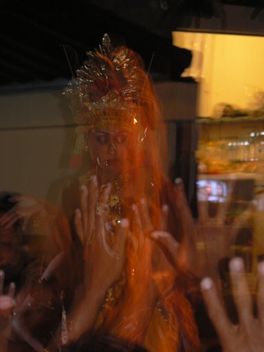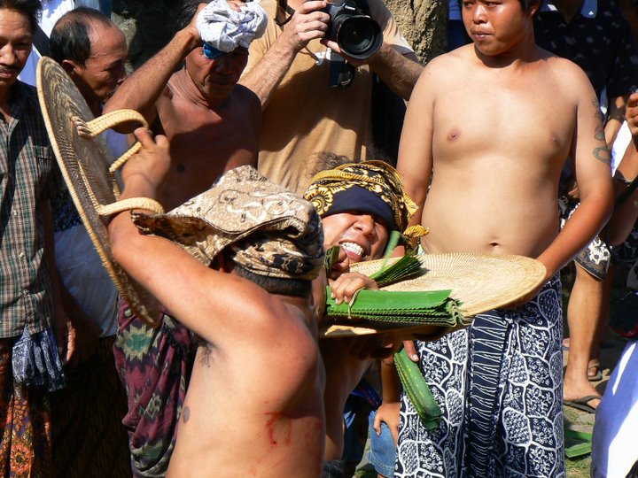 Quant aux combattants que vous voyez en photo, il s'agit d'une fête spéciale qui n'a lieu qu'une fois l'an dans le petit village animiste de Tenganan, près de Candi Dasa. Même là, les lutteurs (presque tous les hommes du village), pansent leurs plaies mutuellement après la bagarre et partagent ensuite un grand repas en toute amitié. Cette cérémonie honore Indra, la déesse de la guerre. Par la suite, dans les années 90, cette dernière s'est reconvertie de guerre lasse en faisant une électro-pop ringarde. Des millénaires de barbaries pour en arriver à cette conclusion : faites l'amour pas la guerre…