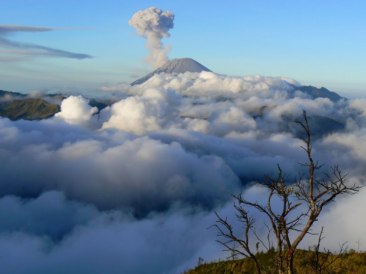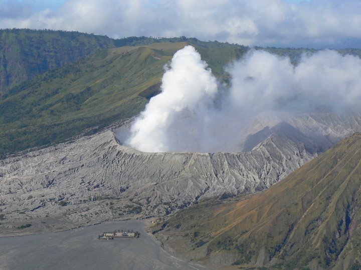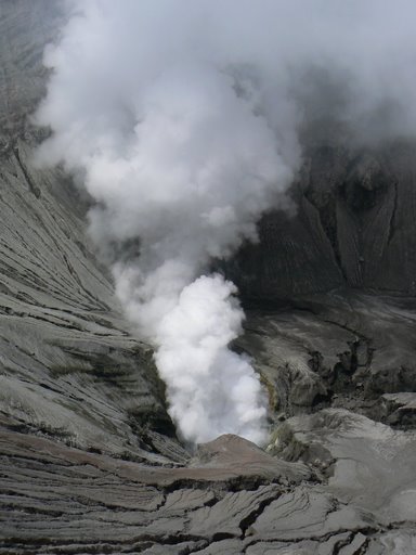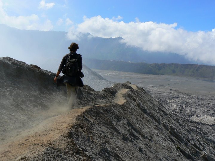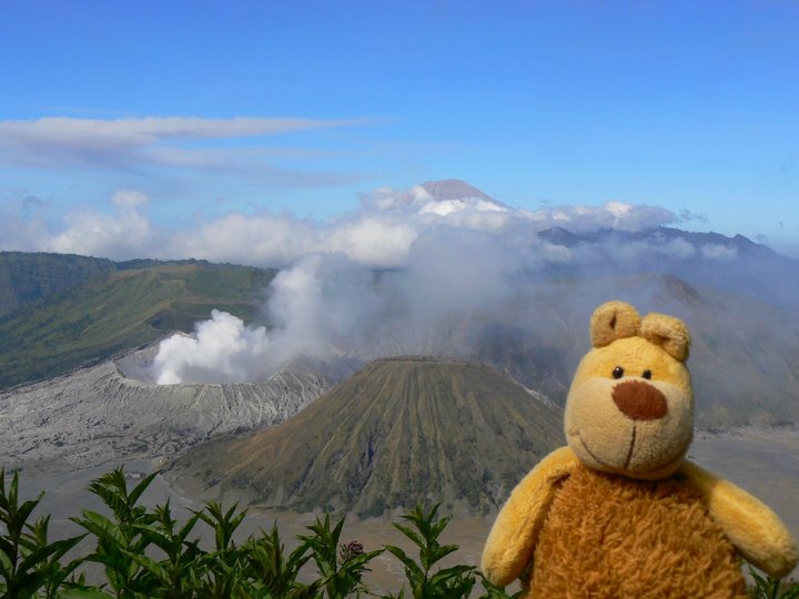 2 jours plus tard, je me rends au Volcan Bromo qui fume continuellement. Ce n'est pas bon pour la santé, mais bon c'est son problème et je crois qu'il s'en moque. En arrière-plan, le Semeru (3676m) en est incommodé et, environ toutes les demi-heures, celui-ci « tousse » un gigantesque nuage de fumée. Assez parlé, le spectacle invite à la contemplation et au silence…