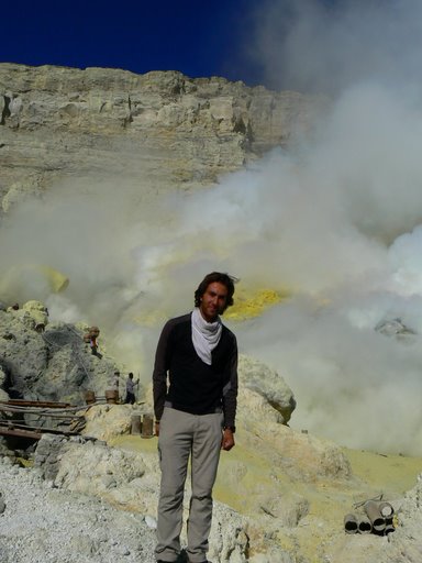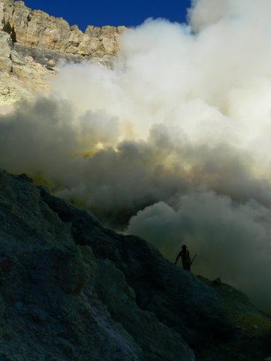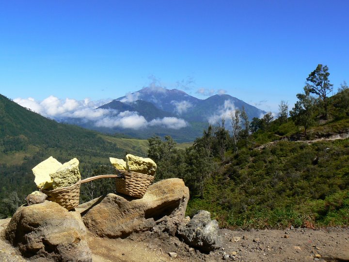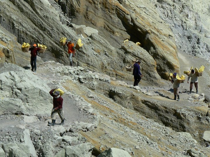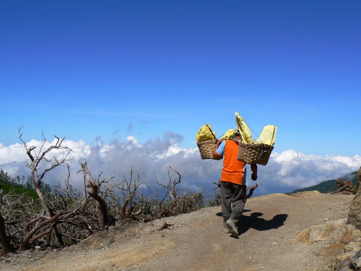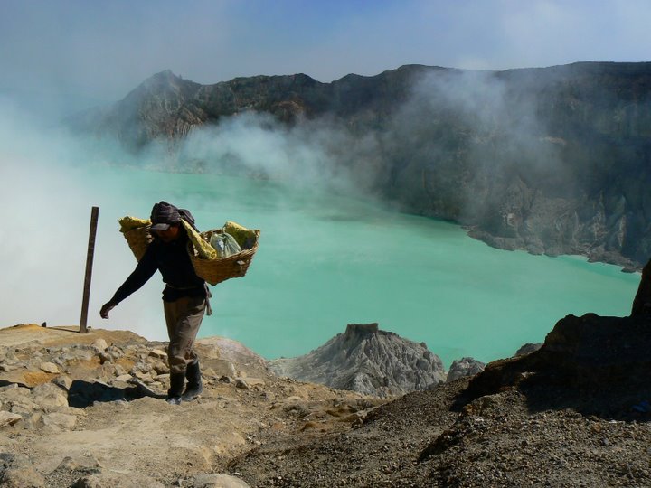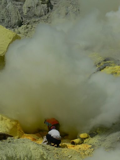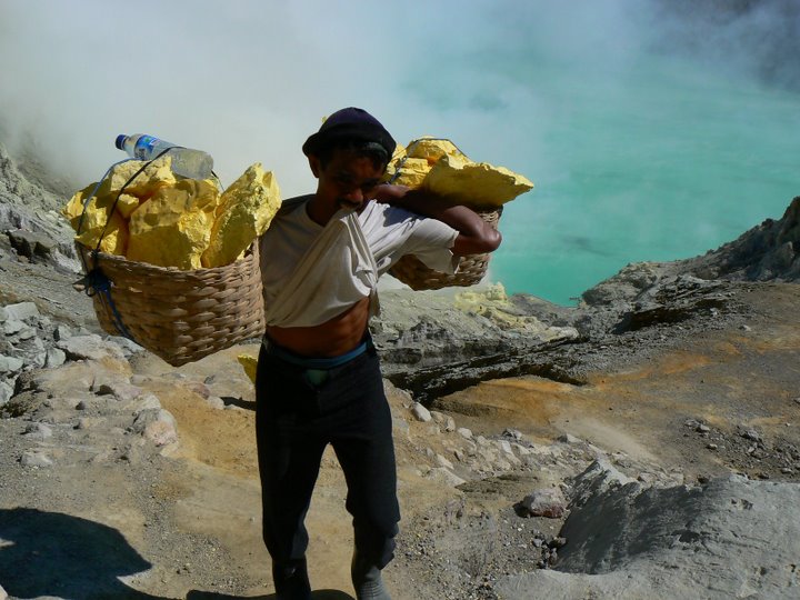 Le Kawa (pour les intimes et parce qu'il est au cœur des plantations de café), en dehors de sa beauté, vaut le détour pour y rencontrer les hommes qui travaillent dessus. Sur ses pentes, ceux-ci acheminent dans de lourds paniers le souffre extrait du cratère. Le soufre sort à l'état liquide à 120?C, puis se refroidit. En bas des tuyaux de récupération, des hommes collectent le soufre dans une atmosphère irrespirable, emplie de vapeurs sulfureuses. Quant aux porteurs, ils chargent en moyenne entre 60 et 80 kilos dans leurs paniers à balancier avant de gravir les pentes du cratère et de redescendre les flancs du volcan jusqu' au campement où l'on pèse la « cueillette ». Le soufre est ensuite vendu à une coopérative et servira au raffinement du sucre. Ne me demandez pas comment, je suis géographe pas chimiste ! Les porteurs reçoivent 250 roupies par kilo et peuvent ainsi espérer gagner 40000 roupies par jour, ce qui n'est pas si mal en Indonésie : 3 euros… No comment. Inutile de vous dire que la pénibilité de ce labeur affecte directement leur espérance de vie, utile de vous dire que je les ai filmé qui chantaient en montant leurs paniers… De la même façon, en dehors de notre troc cookies/bout de soufre, l'échange de sourires n'était pas en reste. Pensez à eux demain matin en vous réveillant, le poids de la vie vous semblera plus léger, que leur fardeau.
