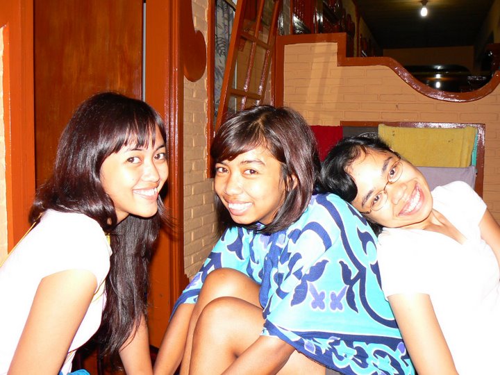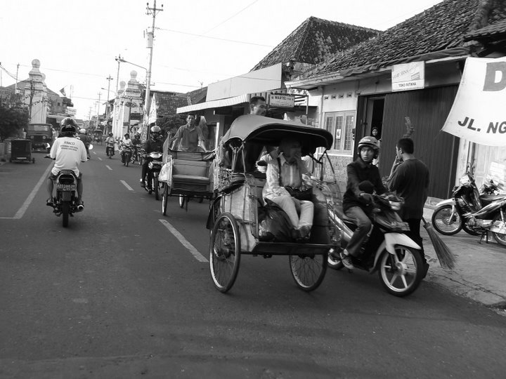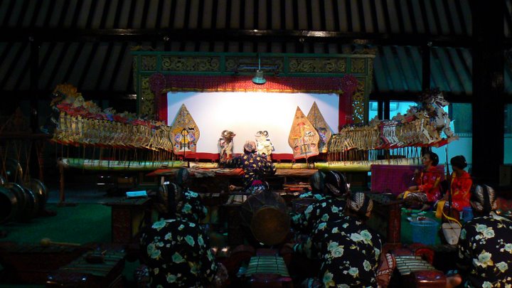 Sorti de là, j'emprunte un becak pour continuer ma visite de la ville. Le becak, c'est un cyclo-pousse, une institution à Yogya qui en compte plus de 12000 ! Le conducteur, haut perché sur sa selle, vous emmène tranquillement mais absolument pas sûrement où vous voulez, respectant le code la route indonésien : je roule où je peux, j'ai pas de phare et je suis à contre sens… Sensations fortes garanties ! Il n'empêche que je trouve ce moyen de transport tout à fait adapté pour la ville. Il est non polluant et permet aux conducteurs de gagner un peu leur vie. Le soir, j'assiste à un fabuleux spectacle de wayang kulit. Il s'agit d'un théâtre d'ombres avec des marionnettes qui sont, au préalable, réparties de parts et d'autres d'un grand écran selon qu'elles font partie des méchants ou des gentils. Pourvu que les méchants perdent et que les gentils gagnent ! Un gamelan (orchestre) accompagne le dalang (montreur). Celui-ci est assis en tailleur sous une lampe dont la lumière va réfléchir les ombres et créer toute la magie du spectacle. Bon ok, c'était super ennuyeux, voire soporifique, prochain coup je vais voir Guignol. Je m'identifie plus au personnage.