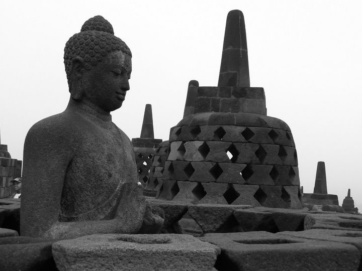 Avec tout ça, j'en oublierais presque mon « en voilà… ». M'en veux-tu ? Merci. Les alentours de Yogya abritent deux temples majeurs : Prambanan, l'hindouiste et Borobudur, le bouddhique. Ce serait un peu long de vous en parler plus en détails ici. Simplement, ces deux géants ont étés construit au IX ème siècle, à une époque où la France ne comptait pas encore une seule cathédrale. Les deux religions conquérantes venues de l'Inde, essayèrent ainsi de mettre la mainmise sur Java et d'asseoir leur religion. Le bouddhisme évincé, les dieux hindouistes s'installent pour un temps dans les cieux javanais. Au XVème siècle, l'expansion foudroyante de l'islam aura raison de ces derniers qui se retranchent alors dans les cieux de Bali. Si Prambanan est le plus important temple hindouiste d'Indonésie, Borobudur lui ravit la vedette en étant le plus grand monument bouddhique au monde ! J'aimerai vous en dire d'avantage mais des livres entiers traitent du sujet, difficile de résumer les préceptes et les réalisations de ces croyances religieuses. Par exemple, juste pour la photo. Chaque « terrasses » du temple de Borobudur est ornée respectivement de 32, 24, et 16 stûpas ajourés (en forme de cloche, symboles du Mont Merou). Chaque stûpa est percé d'une série de petites ouvertures en forme de losange et abrite une statue de Bouddha dont la position des mains varie d'un stûpa à l'autre selon l'orientation. A l'Est, Bouddha a la main dirigée vers la terre, ce qui signifie qu'il prend celle-ci comme témoin. Vers l'Ouest Bouddha médite les mains jointes. Vers le Sud, il est dans l'attitude de la charité, la main droite sur le genou. Troublant quand on pense à ceux qu'on nomme « les pays du Sud ». Enfin, vers le Nord il est dans l'attitude de celui qui dissipe la peur. Vous voyez, c'est plutôt riche en symbolique, je vous parle des bas-reliefs ? Non. D'ailleurs, ici comme en France, ce sont les vacances scolaires alors finie la leçon. Allez donc jouer dehors. Oui, oui, les grands aussi, il y a un beau soleil aujourd'hui (si ce n'est pas le cas c'est que tu n'as pas choisi le bon jour pour me lire, voilà tout). Alors bonnes vacances à tous les écoliers, les collégiens, les lycéens et leurs équipes pédagogiques et… « Scout toujours », pas « scoot toujours », utilisez vos gambettes, ça sauve la planète ! Oh c'te final !