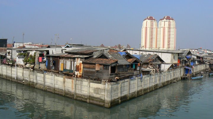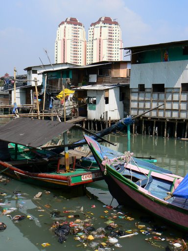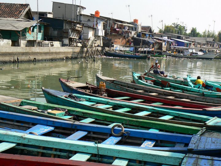 Le lendemain, j'entreprend de me rendre au vieux Jakarta (ex Batavia) et plus précisément au port de Sunda Kelapa, où les marins Portugais puis Néerlandais ont débarqué, où tout a commencé. Je suis autorisé à monter sur un des nombreux bateaux bugis amarrés le long du quai. Ceux-ci sont construits non seulement sans plan dessiné, mais aussi sans clou (ceux en photo sont de simples pirogues). Ce qui m'intéresse le plus c'est de voir comment ces hommes et leurs familles vivent au quotidien. Je prends donc le chemin de leur village à deux pas. Mes parents vont encore s'amuser de savoir que je marche alors sur les traces d'une de leurs deux émissions préférées. Si au Kawah Ijen, on m'avait parlé de Nicolas Hulot, voilà qu'on me parle ici de Georges Pernoud (Thalassa) ! Là, je découvre le vrai Jakarta, loin des fastes des grands centres commerciaux ou des buildings du centre-ville et au plus près de la réalité des millions d'habitants de la capitale. Des baraquements incertains surplombent le cours de monceaux d'ordures. Je vous laisse regarder les photos qui parlent d'elles-même. Et bien, même là, les habitants répondent à mes sourires, mes « pagi ! » (bonjour). Je tire un grand coup de casquette au peuple indonésien pour son accueil, sa gentillesse. L'Indonésie s'annonce d'ors et déjà comme un coup de cœur de ce grand périple…