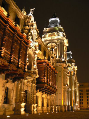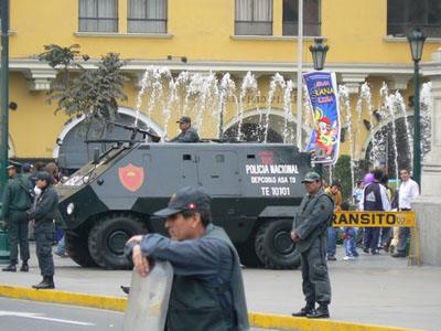 Bonjour tout le monde. Comme vous pouvez le constater nous sommes bien arrivés, aussi après 25 h de trajet nous nous sommes reposés jusqu’aujourd’hui. Je plaisante bien sûr… Notre petit hôtel ( oui, on ne plante pas de Quechua dans une ville de 9 millions d’habitants…) est situé au coeur de la capitale. Notre première ballade nous emmène vers la Plaza de Armas. Magnifique place aux facades colorées où siège entre autre le gouvernement, autant vous dire que la place est gardée (cf photo). De manière générale, la police est très présente et la politique de la ville est de faire de cette énorme agglomération un lieu sûr… bon courage! Il suffit en effet de quitter un peu le centre pour sentir encore d’avantage le poids des regards sur nous, “los gringos”… Il est donc capital de faire la caméra discrète pour ne pas attirer les convoitises, domaine où nous excellerons rapidement (ou comment cacher une caméra dans une courgette…).