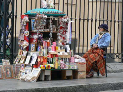 Nous avons également visité le quartier chinois (barrio chino), haut lieu de la vente du tout et du n’importe quoi, tout ceci au marché noir. On peut, dans toute la ville, observer des petits vendeurs comme cette dame en photo, proposant bonbons, boissons, mouchoirs, cigarettes… de quoi gagner quelque argent, tout simplement…