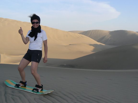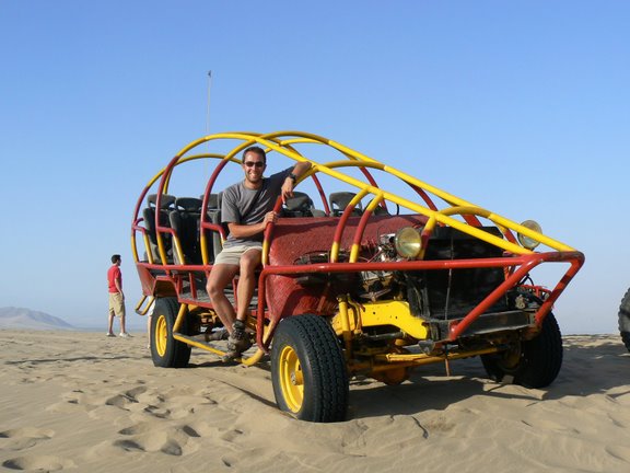 Si hier j’ai monté la dune pendant une heure, il y’a aussi des remontées mécaniques ici: les buggys! Nous voici donc partis pour une escapade dans les dunes qui enserrent la petite lagune de Huacachina. Niveau conduite, je vous avais déjà parlé des Péruviens en voiture. Je vous laisse donc imaginer ce que cela peut donner en buggy!! Pour tout vous dire, on est loin de retrouver la glisse du ski ou du snow sur neige, mais l’expérience n’en reste pas moins appréciable! Le mieux est encore de se mettre dessus la tête en avant et roulez jeunesse, n’est-ce pas Mélanie?
