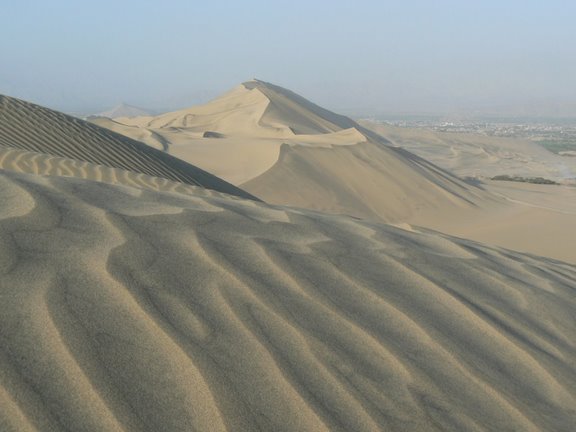 Nous voici maintenant parti pour l’ascension du Cerro Blanco, la plus haute dune de sable au monde (2078m). La balade est magnifique; grands cactus, plantes aphrodisiaques et surtout un désert à perte de vue. Puis, viennent les dunes. De petits morceaux blancs jonchent le sol et attirent mon attention. Ricky, notre guide, nous explique qu’il s’agit d’ossements séculaires appartenant à des animaux sacrifiés aux dieux, mais aussi plus tristement à de jeunes femmes vierges… apparemment c’est fondé, gloups!