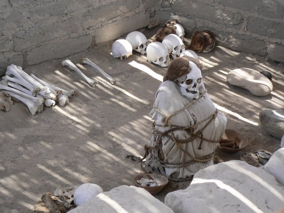Avant de survoler les célèbres lignes, nous avons rendu une petite visite à ceux qui probablement les ont réalisées. Le cimetière de Chauchilla à une trentaine de kms au Sud de la ville permet de découvrir des momies de la culture nazca (vers l’an 1000). Celles-ci étaient récemment encore disséminées dans le désert, abandonnées par les pilleurs de tombes qui ne s’intéressent bien sûr qu’au profit qu’ils tireront de leurs macabres exactions (bijoux, poteries…). Ce butin est ensuite vendu à des touristes affairistes et part dans des collections privées. Voilà comment l’Histoire du Pérou est disséminée aux quatre coins du monde… Dans ces tombeaux familiaux, toutes les momies sont tournées vers l’Est (levé du soleil), en position de foetus (on leur coupait les tendons des jambes pour ce faire), pour pouvoir se réincarner. On a trouvé auprès des défunts, des poteries figurants les même symboles que ceux des lignes…