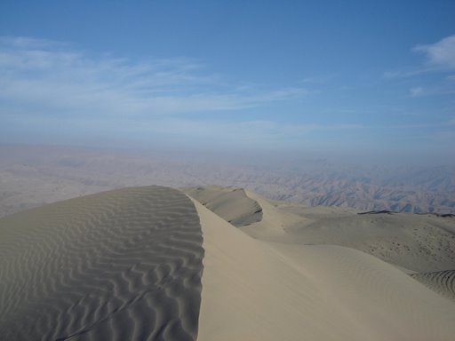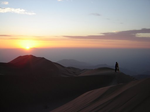 Vers 17h, nous arrivons au sommet c’est magnifique! La 2ème récompense est que nous allons maintenant pouvoir redescendre tout ceci en sandboard, surfer la plus haute dune de sable au monde, whaouh! Sauf que, les petits conseils et essais techniques réalisés, il commence à faire réelement nuit! Si bien qu’au milieu de la plus grande dune (1200m de descente), je devrai me résigner à adopter la fameuse technique ancestrale (chère à Mélanie): “sobre el culo”, vous m’aurez compris!