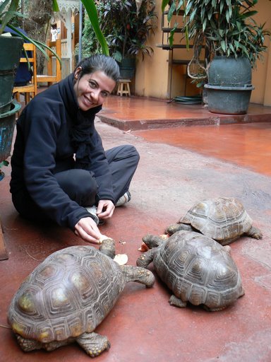 Petit déj avec nos amies les tortues à qui Mélanie donne la becquée, mine de rien c'est un animal sauvage… Puis visite du Monasterio San Francisco, célèbre pour ses catacombes et sa bibliothèque qui contient des milliers de textes anciens, dont certains datent de l'époque des conquistadores. Ensuite nous nous dirigeons vers le cerro San Cristobal, colline à 409m d'altitude (oui, bon d'accord pas très impressionnant), qui offre un vaste panorama sur la tentaculaire Lima. Nous prenons un petit bus car il nous faut traverser un quartier peu sûr pour s'y rendre, après une bonne heure de tour du quartier, vamos al cerro…
