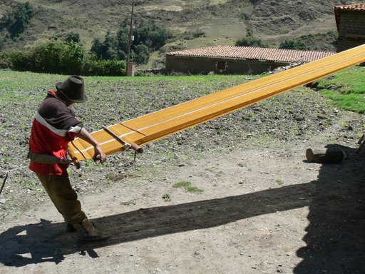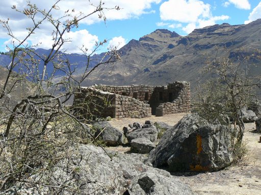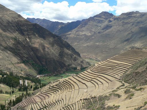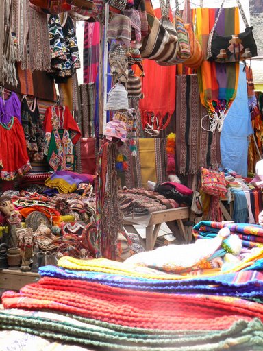 Le marché est splendide, je dirais même “beau de couleurs”(petit clin d’oeil perso). Par centaines, les marchands ont parcourus de nombreux kms de bonne heure pour installer leurs flamboyants étals. Pommes de terre (2000 variétés au Pérou), fruits, fleurs, teintures (cf photo)…et puis il y’a le marché artisanal: tissus, bijoux, instruments de musique, bonnets… Bon gré, mal gré nous quittons le marché pour nous rendre aux ruines. Nous devons acheter sur place un “boleto turistico” (n.m. billet donnant droit, pour une somme rondelette, d’appartenir à la catégorie des vaches à lait qui, pour une journée, peuvent paîtrent sur le site). Le boleto en poche, let’s go! Le site, très étendu, est heureusement magnifique. Il s’agit d’une ancienne citadelle inca qui jadis gardait farouchement la vallée. Les murs (assemblage de pierres aux multiples faces parfaitement imbriquées), les sublimes cultures en terrasses et les canaux toujours en fonction, ont resistés à l’épreuve du temps et témoignent de la grandeur de cette civilisation.