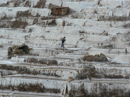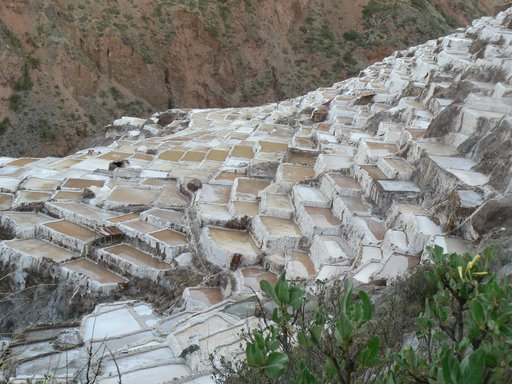 Puis, nous nous rendons à Salinas. Après une petite marche sur un sentier escarpé nous arrivons aux salines. Là, des centaines de puits salants permettent, après évaporation, de récolter du sel. On est les seuls sur le site, c’est impressionnant, je teste l’eau; pas de doute c’est bien salé! Quelle magnifique journée encore!