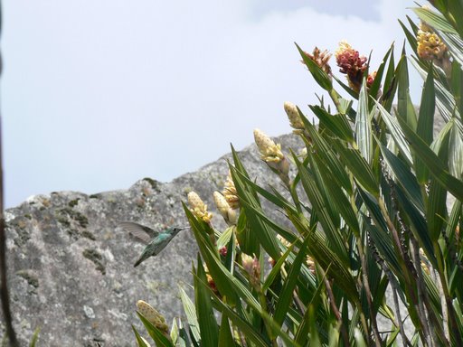 Puis, dans un massif de fleurs, un bourdonnement singulier attire notre attention. Mélanie a vu “un gros papillon vert”, j’ai ma petite idée sur l’OVNI: c’est un colibri! J’adore ce petit oiseau, il est fascinant. Il est capable de faire du vol sur place en effectuant avec ses ailes un huit horizontal à une cadence de quelques 80 battements d’ailes/sec. De ce fait, son petit coeur bat très vite pouvant atteindre 1200 pulsations/mn, il avale donc chaque jour l’équivalent des 2/3 de son poids en nectar pour compenser cette énorme dépense énergétique. Nous nous postons donc là, à l’affût d’un prochain passage pour pouvoir le capturer… en vidéo bien sûr! Notre attente est récompensée au bout d’une bonne heure. Après plusieurs passages éclairs version rafale, il vient enfin quelques secondes se délecter du précieux nectar, c’est magique!
