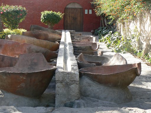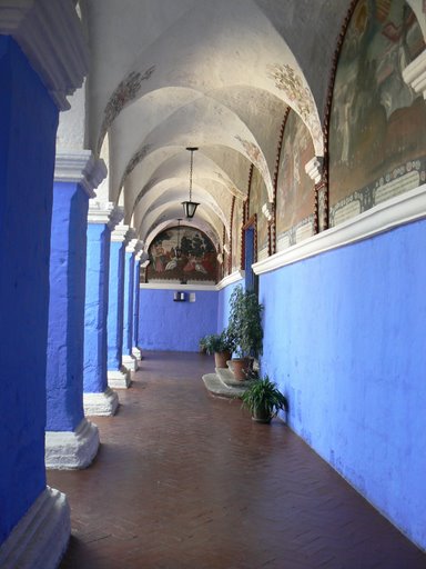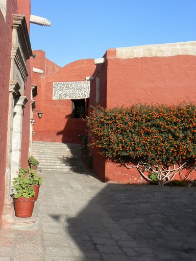 L’après-midi, nous avons visité le Monasterio de Santa Catalina. Construit en tuf de lave, c’est le monument qui exprime le mieux l’architecture coloniale d’Arequipa, métissage d’élèments espagnols et indiens. Dès sa fondation en 1570, des femmes d’origines sociales diverses entrent au couvent pour devenir des religieuses de clôture qui abandonnent à jamais leurs familles. Ce grand monastère (20000m²) est un paradis pour la photo; cours intérieures fleuries, murs rouges, bleus vifs, portes et fenêtres aux bois moulinés… Mais bon la claustration… très peu pour nous!