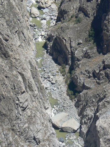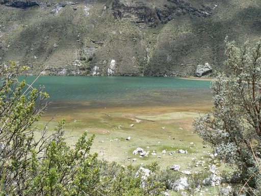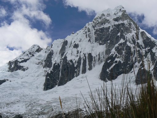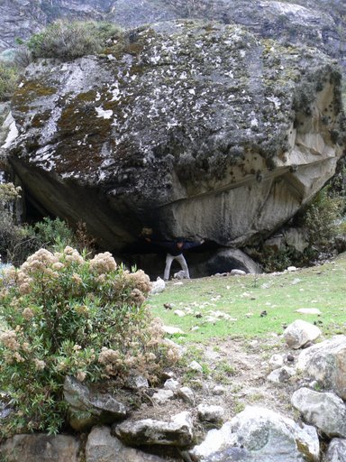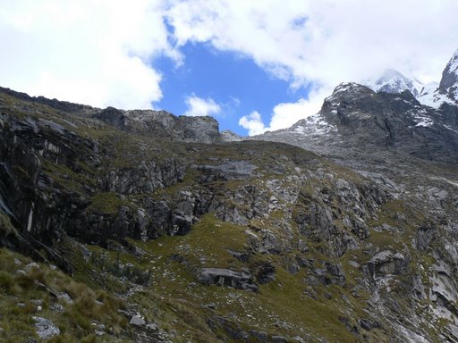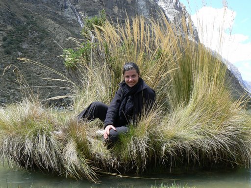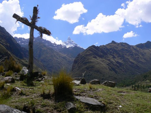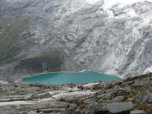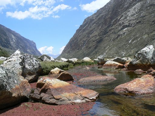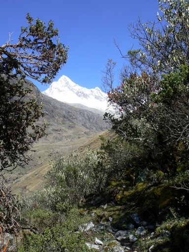 6h32, on frappe à la porte. On a 2 mn de retard sur le rendez-vous pour le trek, nous qui croyions que c’était presque bien vu d’être en retard au Pérou…Nous partons donc immédiatement : le guide, 2 autres français avec qui nous avons lié connaissance, 5 américains et tous ceux que l’on charge ici et là, histoire de rentabiliser le collectivo (mini bus)…Après 2h de colectivo et 1 crevaison, nous empruntons une piste à flanc de colline et c’est parti pour 3h de plus. Cela tangue sévèrement mais le paysage compense largement. Au bout de 40km de piste, nous pénétrons dans le Parc Nacional Huascarán. A midi, arrivés à destination, nous nous mettons en route. Le rythme est vraiment soutenu (pour les vosgiens : vous connaissez la course des chamois?), c’est un peu frustrant car je ne peux pas faire toutes les prises de vue que je voudrais et le paysage est magnifique! Pour une première journée de trek facile... Ca fait un peu peur pour le lendemain. Nous arrivons au camp vers 16h. Celui-ci se situe a 3850m d'altitude, l'équivalent en France de l'Aiguille du Midi si je ne m'abuse...