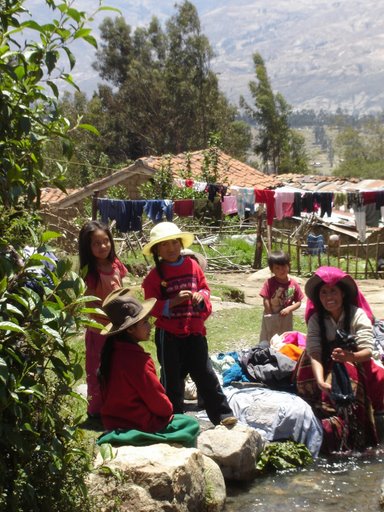 Nous avons réservé un trek de 4 jours auprès d’une agence dans la Cordillera Blanca. Depuis peu, il est obligatoire d’être accompagné d’un guide pour pénétrer dans le Parc National Huascarán (6768m, point culminant du Pérou et plus haute cime tropicale au monde). Pour s’acclimater un peu, l’agence nous propose une petite ballade de 3, 4 heures gratuitement avant le grand départ demain. Nous voici donc à quelques 3500m, cette fois-ci on est vraiment dans les Andes! La balade est magnifique; sommets enneigés, petits ruisseaux, Péruviens “traditionnels”… Nous traversons de minuscules hameaux où les femmes lavent le linge dans les cours d’eau, partout on peut observer le travail des champs, les enfants quémandent quelques “caramelos”… C’est magique!
