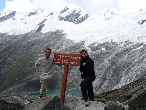 Le tout parsemé de petits ruisseaux et encerclé de somptueux sommets enneigés, pas mal… Assez vite, on commence un peu à souffrir. Maux de tête, difficulté à trouver son souffle… Mélanie se sent oppressée au niveau du thorax. La dernière heure d’ascension sera vraiment une épreuve de force, Mélanie n’est pas bien, moi mieux mais j’ai les sacs… Enfin vers midi, nous arrivons à Punta Unión : 4750m! Nous n’avons jamais étés ni l’un, ni l’autre, aussi haut. C’était si dur et c’est devant nous tellement beau qu’ils nous faut réprimer une petite larmichette. La descente est bien sûr plus évidente, néanmoins les Tambours du Bronx semblent entonner le même refrain dans nos têtes à chacun de nos pas… Le temps se couvre. Nous n’avons plus que 2 heures de marche pour rejoindre le prochain camp. Une belle grêle soutenue ponctuera nos derniers pas. Rude mais belle journée! Nous allons passés la nuit à 4250m!