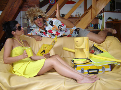 J-60 ! : Bon, où sont mes tongues ?! Ca se précise… 2 mois avant le grand voyage ! D’ailleurs, les préparatifs battent leur plein. Cela ne s’improvise pas un tour du monde, pas de place pour la légèreté ; il faut de la rigueur et de l’organisation. Là, par exemple, on bosse dur sur l’organisation de notre fête de départ. La thématique est déjà trouvée, ce sera une « Yellow » (adj. anglais : jaune, faire une yellow : peu usité, consiste à faire une grande fête basée sur les thèmes développés dans un vieux nanard dénommé « Brice » qui probablement ne fait rire que les déjantés comme nous…) Ah… toi aussi tu as ri ?!