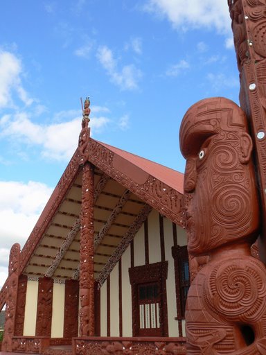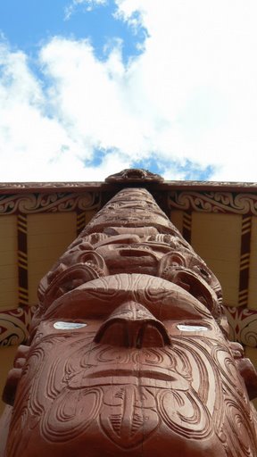 L'après-midi, nous visitons la magnifique maison commune maorie de Rotorua. Ces lieux de réunion jouent un grand rôle dans la vie sociale de la communauté. Leur toit dont le faîte symbolise la colonne vertébrale tribale et la bordure de pignon les bras des ancêtres, repose sur des poteaux enfoncés dans le sol. Des figures d'aïeuls et de chefs ornent les murs et le toit. C'est pas pour être moqueurs mais il y en a qui avaient de drôles de têtes, vous ne trouvez pas ? Le cimetière qui jouxte la petite église en bordure du lac est une surprise. Les tombes sont en fait au-dessus du sol à cause de la chaleur de celui-ci.