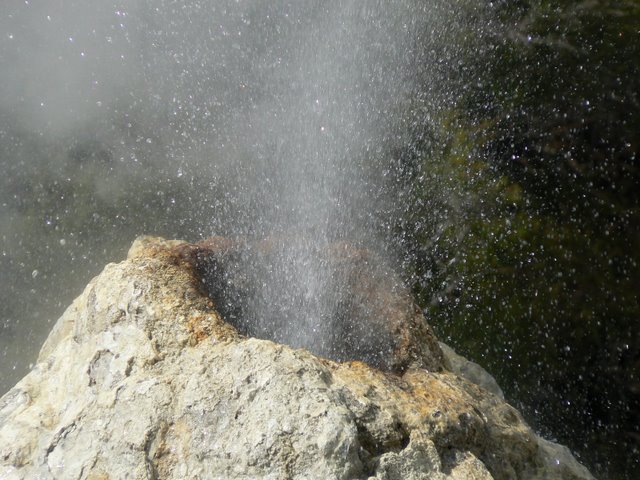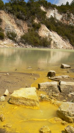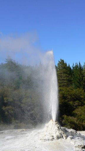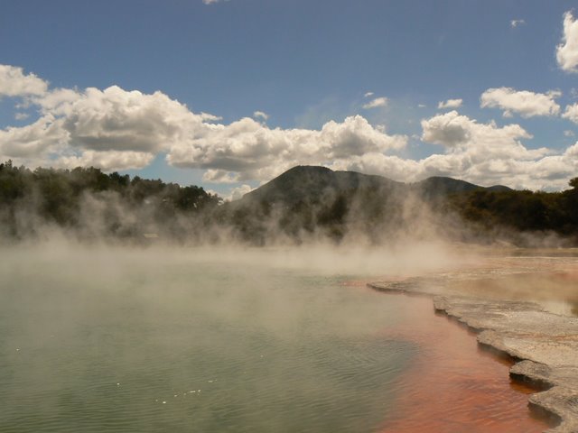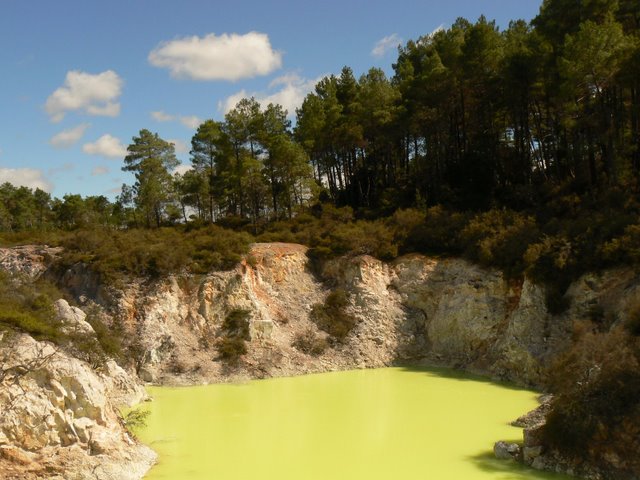 Voici une journée bien remplie ! Après une petite course matinale, nous arrivons à temps pour voir la « mise en route » du Lady Knox, un geyser qui tous les jours à heure fixe, projette eau et vapeur jusqu' à 20m de hauteur. Nous sommes cette fois-ci au centre de l'île nord, près de Rotorua, au parc géothermique de Wai-o-Tapu. En parcourant le parc, on y découvre des cratères, des bassins d'eau et de boues chaudes et froides, des fumerolles. Nous sommes au cœur d'une vaste zone volcanique et géothermique, le parc est un condensé de ce qui émane ça et là dans toute cette région. Ainsi à Rotorua même, la station la plus touristique de l'île du nord, de l'hydrogène sulfuré s'échappe des innombrables fissures du sol et inonde la ville d'un délicat parfum d'œuf pourri ! Les couleurs des bassins et des formations minérales sont totalement irréelles et pourtant bien naturelles. Le bassin « Champagne Pool » par exemple, qui affiche de vifs tons oranges et turquoises, renferme des composants chimiques et des minéraux tels que : or, argent, mercure, arsenic, souffre, thallium, antimoine… bref le plouf n'est pas conseillé ! D'autant que la température de cette « piscine de champagne » est de 74°C.