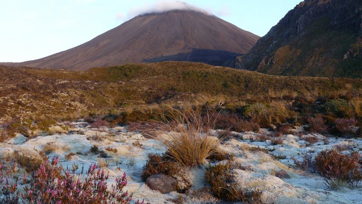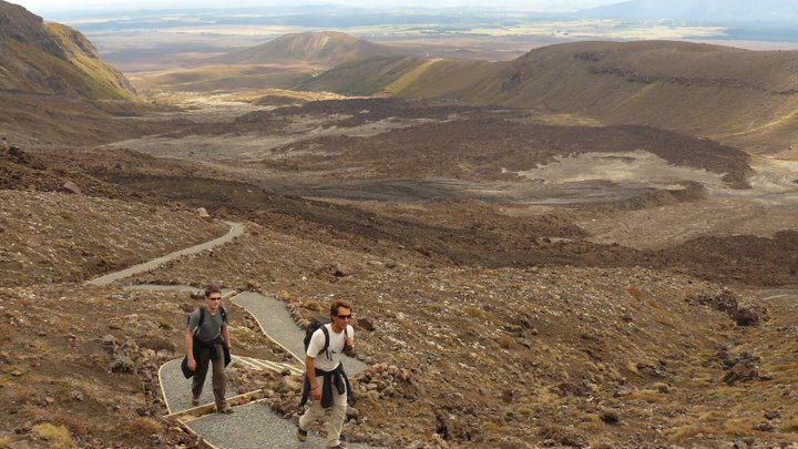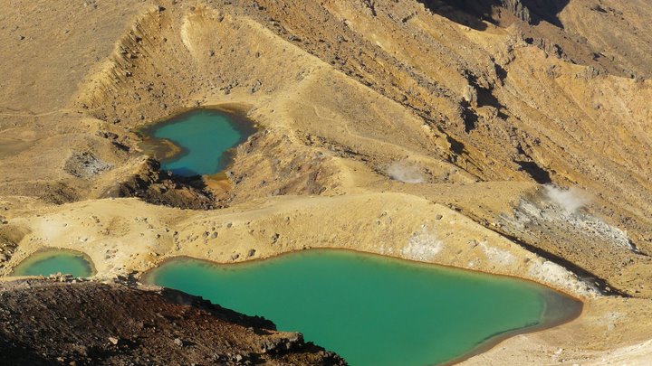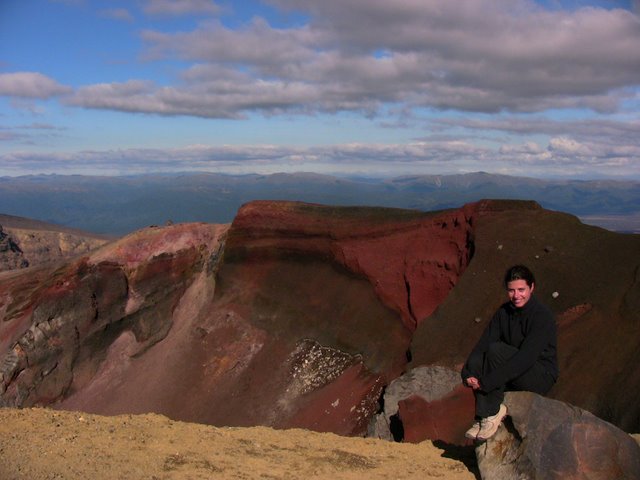 Nous parcourons le Tongariro Crossing, un magnifique et réputé sentier de randonnée jusqu'au Red Crater où, comme son nom l'indique, nous attends un fabuleux cratère rouge, ocre. Celui-ci ménage une vue splendide sur 3 lagunes azurées en contrebas et le grand lac Taupo au lointain. La lumière s'estompe peu à peu, les fumerolles qui se dégagent des crêtes volcaniques se font inquiétantes, il est temps de hâter le pas et de fuir les terres du Seigneur des Ténèbres : « courez pauvres fous ! ». Bon ok, je suis un peu fan, mais a priori je ne suis pas le seul !