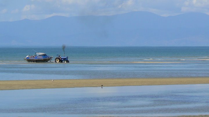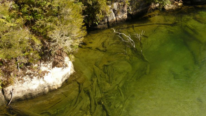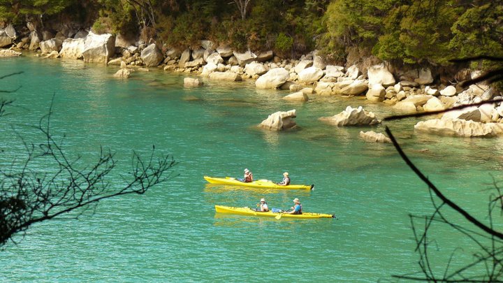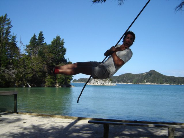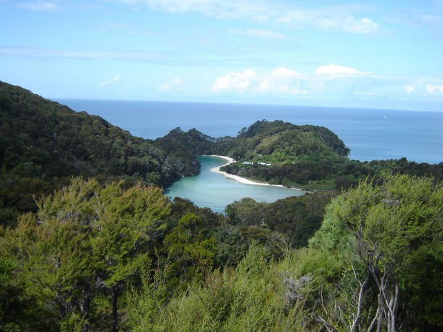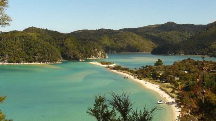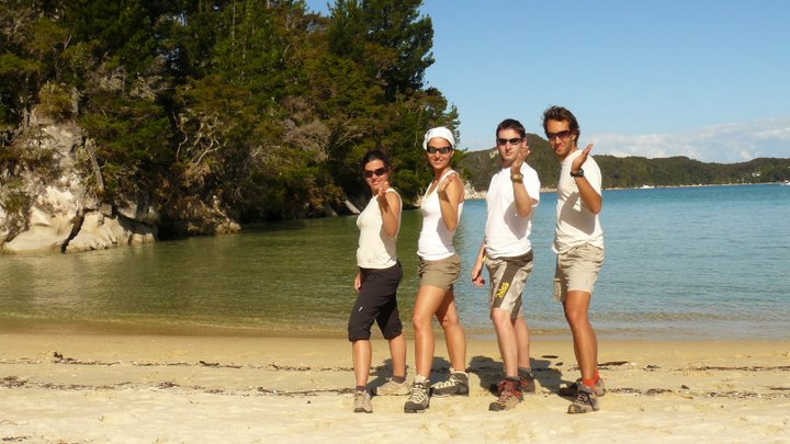 Notre première étape nous mène au cœur du Abel Tasman National Park. Le sentier littoral permet de découvrir des estuaires sableux bordés par la forêt primitive et ses fameuses fougères arborescentes. Beaucoup choisissent d'explorer la côte en kayak de mer, une véritable institution dans le parc, et en Nouvelle-Zélande plus généralement. Des bateaux-taxis permettent de rallier un point du sentier et de ne pas faire l'aller-retour. La vue des tracteurs dans la mer, qui permettent aux bateaux de passer les bancs de sable, peut surprendre au début. Un arrêt pique-nique sur la plage est propice à se remémorer la fameuse soirée Yellow qui fit trembler St Etienne-les Remiremont un certain 28 août 2007 (cf. tout premier carnet de route). Le geste est encore là, « et tu casses ! ».