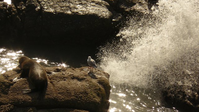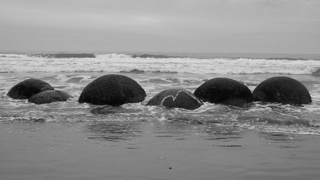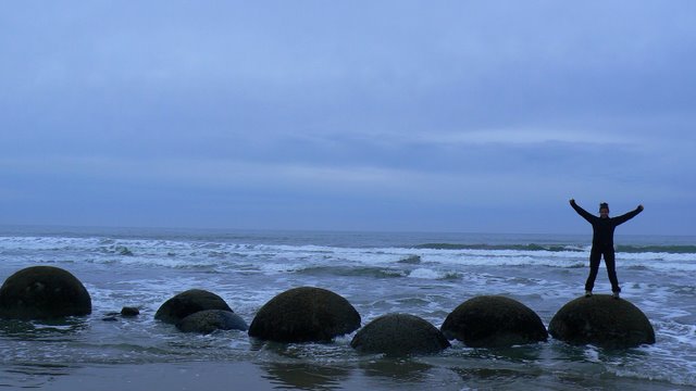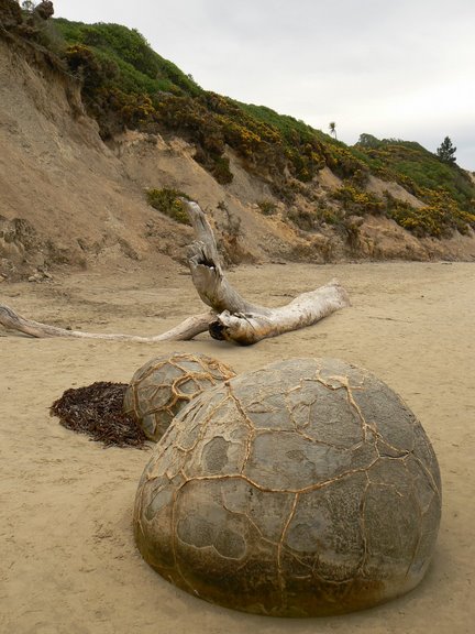 Avant dernière étape de notre périple en Nouvelle-Zélande, nous faisons halte dans la petite ville de Dunedin. Parmi ses édifices aux styles variés, la gare ferroviaire est peu être le plus bel édifice en pierre du pays. De dimension modeste au regard des standards internationaux, ce bâtiment de style flamand est néanmoins un vrai petit bijou. La richesse du décor extérieur et intérieur est saisissante, rien n'a été laissé au hasard, les tuiles en terre cuite du toit viennent par exemple de Marseille. Aller l'OM (Otago-Marseille) ! Après avoir fait une jolie randonnée sur la péninsule de l'Otago, à deux pas de la ville de Dunedin, nous prenons la route vers le Nord, vers notre dernière étape. Nous nous arrêtons à Moeraki. La plage de ce petit village est parsemée de curieux rochers hémisphériques. Ces grosses bouboules se sont formées au fond de la mer il y a 60 millions d'années, par accumulation de dépôts calcaires autour d'un noyau (bois, squelette d'animaux…).