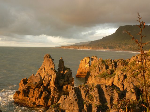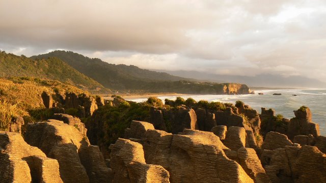 Nous voici sur la West Coast ou Côte Ouest, comme la série télé sauf que West Coast, c'est plus in, en gros ça farte ! Cette côte est la plus sauvage, la plus arrosée, la plus envahie de moustiques mais c'est aussi la plus belle, donc. Nous commençons par Westport. La ville doit son essor à la ruée vers l'or dans les années 1860, comme bon nombre de communes dans la région qui, une fois les ressources épuisées, remplacèrent l'extraction du précieux par celle du charbon. Pratiquemment certains de ne pas voir l'ombre d'une pépite, nous nous rabattons sur les « pitites » notaries, désolé c'est pour la rime, on fait ce qu'on peut. Et puis, la faim nous tenaillant, nous nous mîmes à rêver d'une bonne pile de crêpes ! C'est près du petit village côtier de Punakaiki que nous trouvons notre bonheur : les Pancakes Rocks, des roches qui évoquent des empilements de crêpes. Encore un coup des kiwis (Néo-Zelandais), à chaque fois tu crois que tu vas manger quelque chose de fantastique et une fois sur 2 c'est déjà fermé, l'autre fois ce n'est pas bon... Ah, la France... Bref, revenons en à nos moutons. Euh, non pas tout de suite, mais bientôt, d'abord les crêpes. L'érosion conjuguée du vent, de la pluie et de la mer a donné à ces roches ce curieux aspect en évidant de fines couches de roches meubles prises entre des strates de calcaires plus fines. C'est vraiment joli, d'autant que le littoral est creusé de nombreuses infractuosités et lorsque, à marée haute, la mer s'y engouffre, l'air sous pression projette des nuées d'écumes. Nous ne voyons malheureusement pas de petits pingouins (Kinder Pinguin) mais nous observons à loisir des petits weka. Comme le kiwi, c'est une espèce endémique d'oiseau incapable de voler. Le soir, nous arrivons à Greymouth. Dans un backpacker (auberge de jeunesse) qui a l'air plutôt sympa, nous sommes contraints et forcés de lancer « l'Opération Cyril Lignac ». En effet, après une désormais traditionnelle session Internet, le staff nous explique qu'il est trop tard pour cuisiner (22h01), qu'il y a des rules et que nos steaks on peut se les coller derrière l'oreille, on les mangera demain. Ah ! Trop c'est trop ! On ne badine pas avec la bouffe ! Après des négociations acharnées à coup de « yes but... », le kiwi plie et nous accorde 20mn. Yes ! Ni une ni une, c'est l'apocalypse dans la cuisine, allez faire une ratatouille en 20mn. Mais c'est aussi un grand moment culinaire, le staff Voir plus Loin se dépasse, repousse les limites des bornes du possible. Vive les Français, Vive la cuisine, Cocorico !