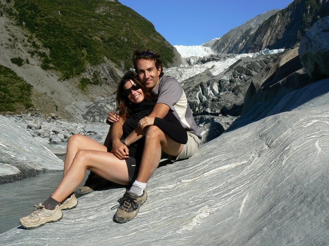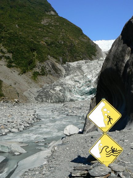 L'après-midi, nous nous rendons aux pieds du Franz Joseph Glacier (ça a 1 ou 2 pieds un glacier ? pour l'orthographe… aller 2, c'est plus pratique pour avancer). En aval, de gros glaçons flottent à la surface du cours d'eau qui résulte de sa fonte, pas de doute il s'agit bien d'un glacier ! [Pour plus de détails sur le mouvement d'un glacier, je vous renvoie à J+111 dans les carnets de route du Chili].