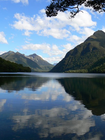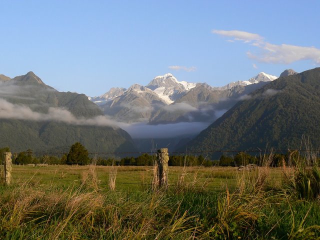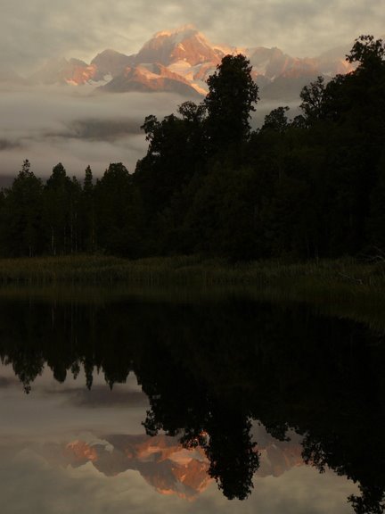 On se dirige ensuite vers le Lac Matheson, dont les eaux lisses offrent un magnifique reflet des monts Cook et Tasman. Bon aller, ça suffit pour aujourd'hui, j'en ai soupé des paysages à couper le souffle. Vesoul, un petit verglas matinal, l'horizon bouché, mon bon vieux break qui rend l'âme au bord de la route… Ca c'est du sport, qu'est ce que j' fais là, mais qu'est ce que j' fais là ?