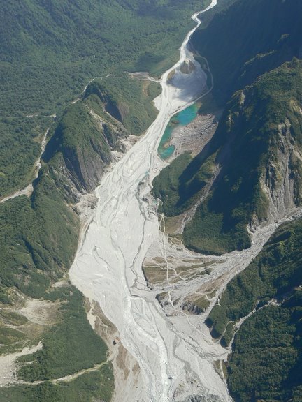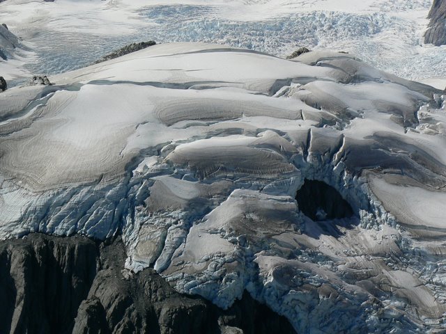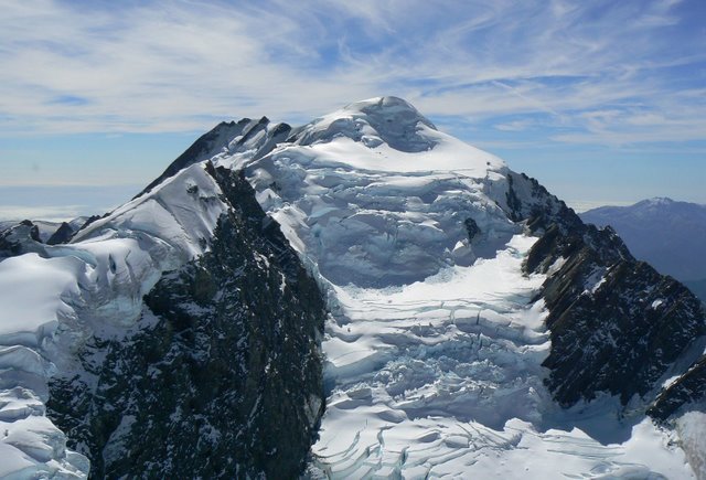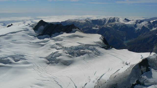 Un ami dit souvent : « Des soirées comme celle-là, on en souhaite à personne ! », et dire qu'on l'invite toujours… En tout cas, des journées comme celle-là, on en souhaite à tout le monde ! Je crois que pour une fois, je vais être bref en paroles et expansif en photos. Nous commençons cette délicieuse journée par un survol du Mount Cook National Park, l'occasion de contempler (c'est le mot) la côte mais surtout de nombreux glaciers comme le Franz Joseph, le Fox, le Tasman, et le seigneur de ces cimes, le Mount Cook. Point culminant de la Nouvelle-Zélande avec ses 3764m, le Mont Cook tire son nom maori –Aoraki- d'une jolie légende. Lui et ses voisins auraient été formés suite à la visite rendue à Papatuanuku, la Terre Mère, par les fils de Rakinui, le Ciel Père : Aoraki et ses trois frères. Quand les jeunes gens descendirent du ciel en pirogue (si, c'est possible, mais pas les jours de grand vent bien sûr), leur embarcation se renversa (ah bah voila, il y avait du vent…). Pétrifiés par le vent glacé (tiens !), la coque et les passagers qui s'étaient hissés dessus devinrent respectivement l'île du sud et ses montagnes.