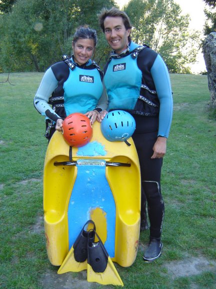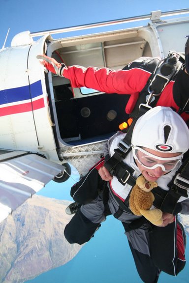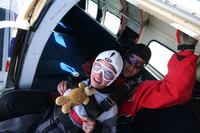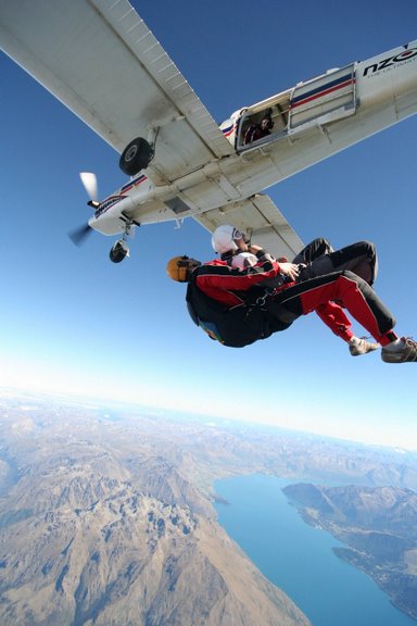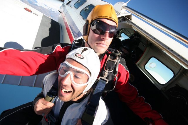 Tout le monde a l'air bien décidés, aller c'est parti, on saute dans les combis. Présentation de Mr Tandem, du photographe, dernier breefing sur la « position banane » et on embarque dans l'avion. Mél est maintenant rassurée, nos binômes sont à la fois super sympas et pro, et puis de toute façon elle a son Doudou, non pas moi, Schkroumpf ! Nous sommes assis sur le plancher de l'avion (mais non il est pas en bois), notre binôme nous coach un peu, nous fait la visite. Rien que pour la vue, ça vaut déjà la peine. On joue avec le cameraman qui nous incite à montrer notre cool attitude en faisant des trucs avec nos doigts genre « on s'appelle ! », ou « Pan, t'es mort ! », c'est normal, on n'est pas loin de Wanak'… Et puis, certains commencent à prendre de l'oxygène, 15000 pieds c'est haut mine de rien (4500m) et encore, par rapport au niveau de la mer, on est à 16500ft soit 5000m. L'altimètre de Mr Tandem est affirmatif, c'est l'instant T, on y est ! On est trois futurs baptisés, le premier est à la porte. Magie : disparition ! C'est impressionnant la vitesse à laquelle notre gaillard est transformé en un PPV (Petit Pois Volant), magie : transformation ! Entre-temps nos binômes nous ont solidement harnachés, c'est mieux. C'est à mon tour. Je suis sur le rebord. Ah quand même, excellent ! Go ! Deux trois « courpelés », triple loops pas piqués des vers (vous imaginez la richesse des expressions vosgiennes !) et on se stabilise en « position banane ». L'avion est déjà loin. Ce moment où, en tournoyant, on voit l'avion disparaître est le meilleur. C'est comment dire, très aérien comme impression. A force d'être en position banane, je me mets à faire le singe. Rassurez vous, je ne perds néanmoins pas une miette du spectacle. Et d'un coup, pan ! Le parachute. C'est fini Superman. Que c'est court, c'était tellement bien ! On rejoint le sol en tournoyant, l'instructeur m'a confié les commandes, pauvre fou ! Mél atterrit quelques secondes après avec une sensation supplémentaire, sans doute propre à elle : « j'ai bu la tasse »… En tout cas, on est ravis de l'expérience ! Nous en profitons pour faire un gros bisou à nos 2 petites Mamans qui nous ont permis de faire ce saut, enfin pas empêchés, enfin bon, elles n'étaient pas vraiment au courant…