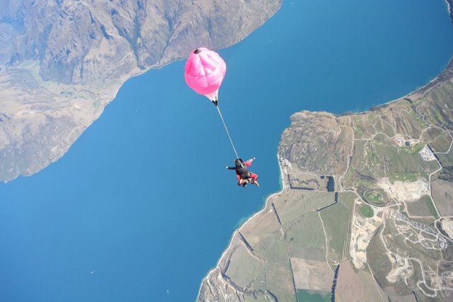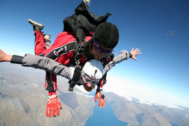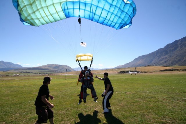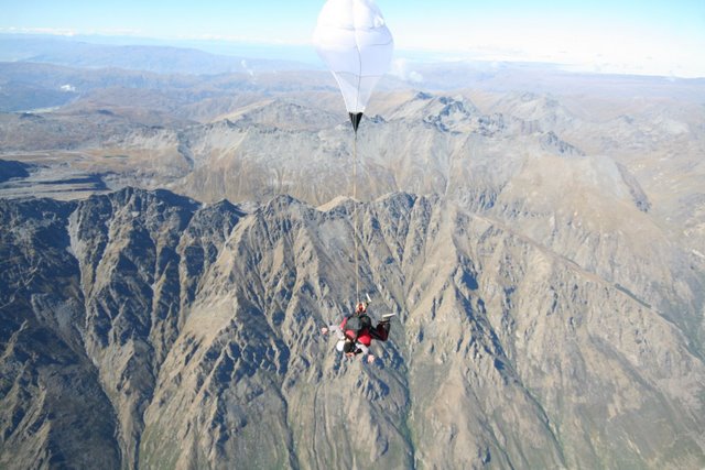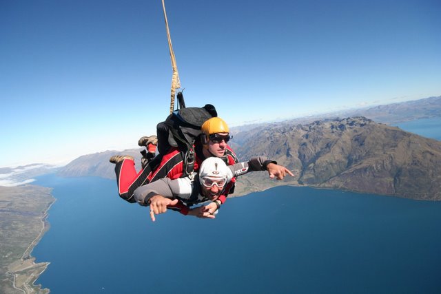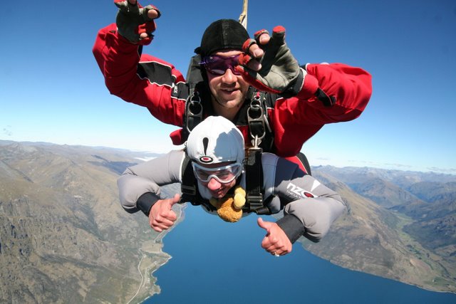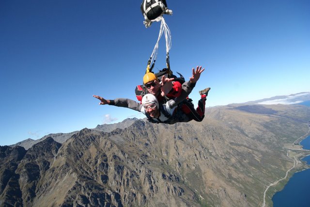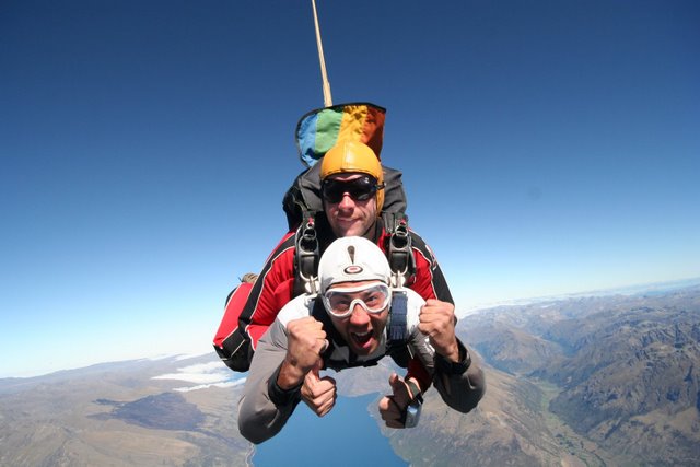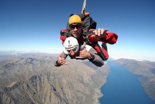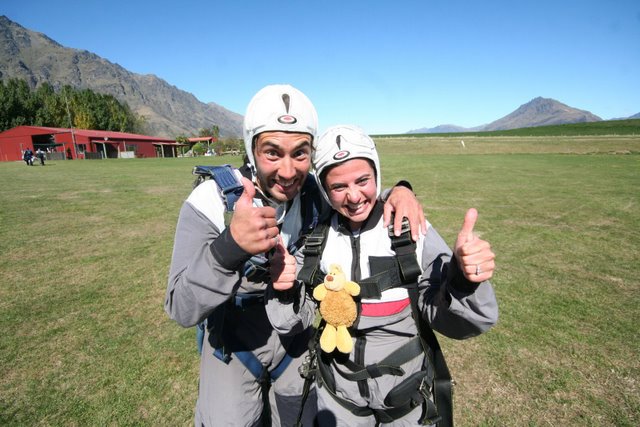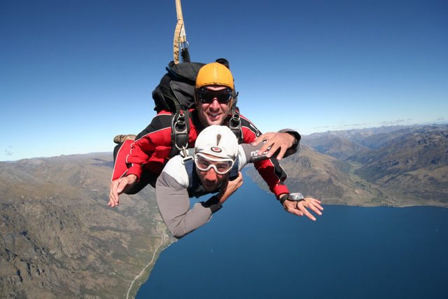 A moins d'une centaine de kilomètres au sud de Wanaka, sur la rive nord-est du lac Wakatipu, au pied de la chaîne des Remarkables, Queenstown bénéficie d'un cadre spectaculaire. Cependant, Alex et Caro partis, le désespoir nous gagne. Pour combler l'absence tout est bon. Nous sommes presque décidés à sombrer dans l'alcool. Impossible ! Une loi néo-zélandaise interdit la vente d'alcool le vendredi et le dimanche de Pâques (faut voir l'état des néo-zélandais le samedi). Redevenus plus raisonnables (ou moins), nous nous disons que le mieux reste encore de prendre un grand bol d'air pur, mais alors un grand ! 15000 pieds (environ 22000 mains) et 200km/h pour une vertigineuse chute : « embrace the fear » (embrasse la peur), scande le petit dépliant que j'ai en main. Ok, même pas peur ! En même temps, cela fait 10 ans que j'en rêve, le grand plongeon ! Rien n'est jamais trop fou ou trop rapide, j'espère être un peu calmé. Le temps comme le cadre sont magnifiques et nous sommes dans la capitale des sports d'aventure, c'est le jour et l'endroit, ok Mél ?